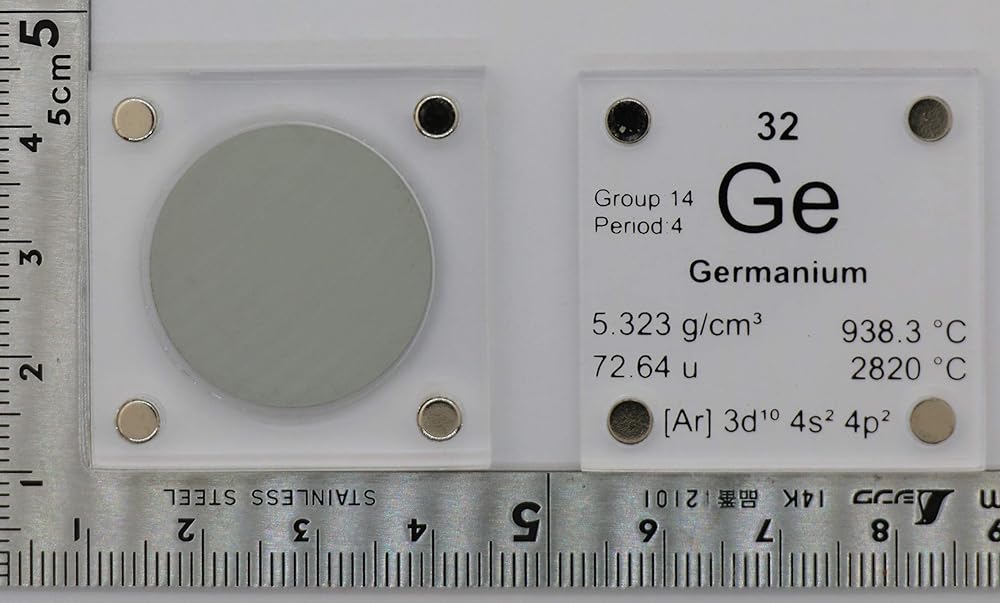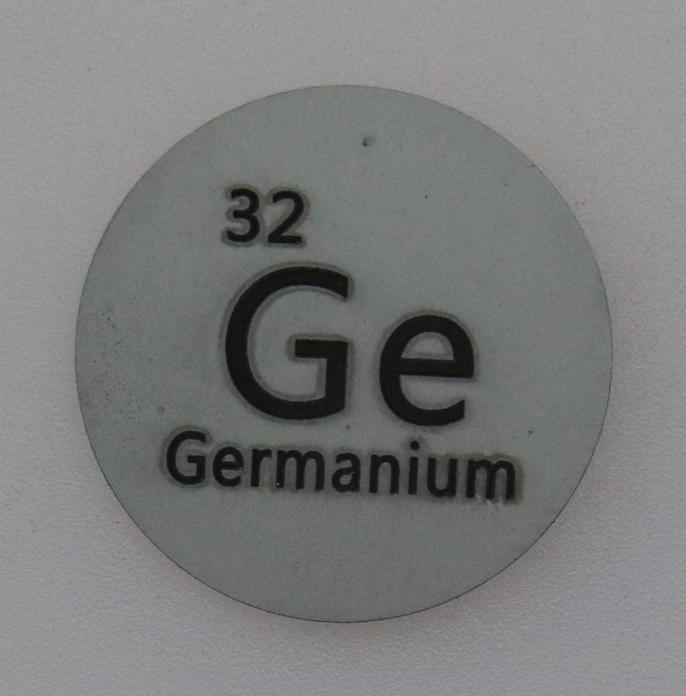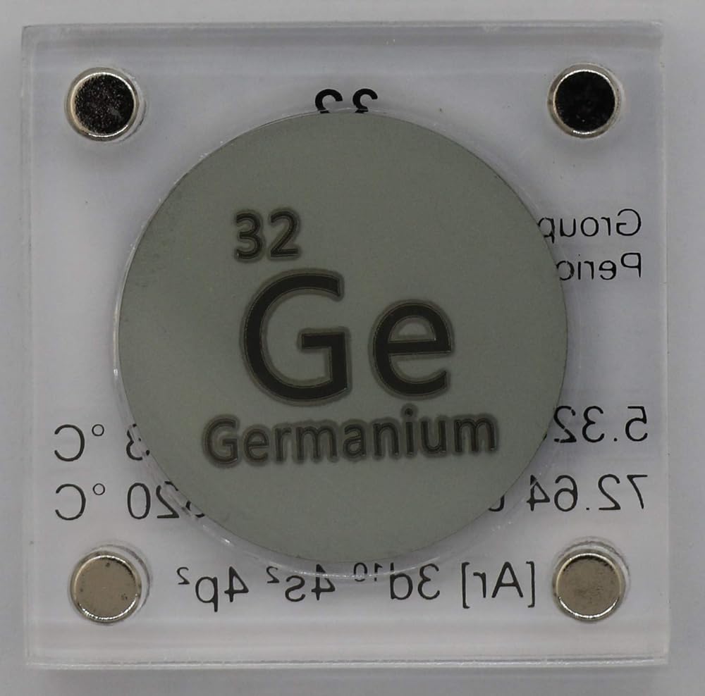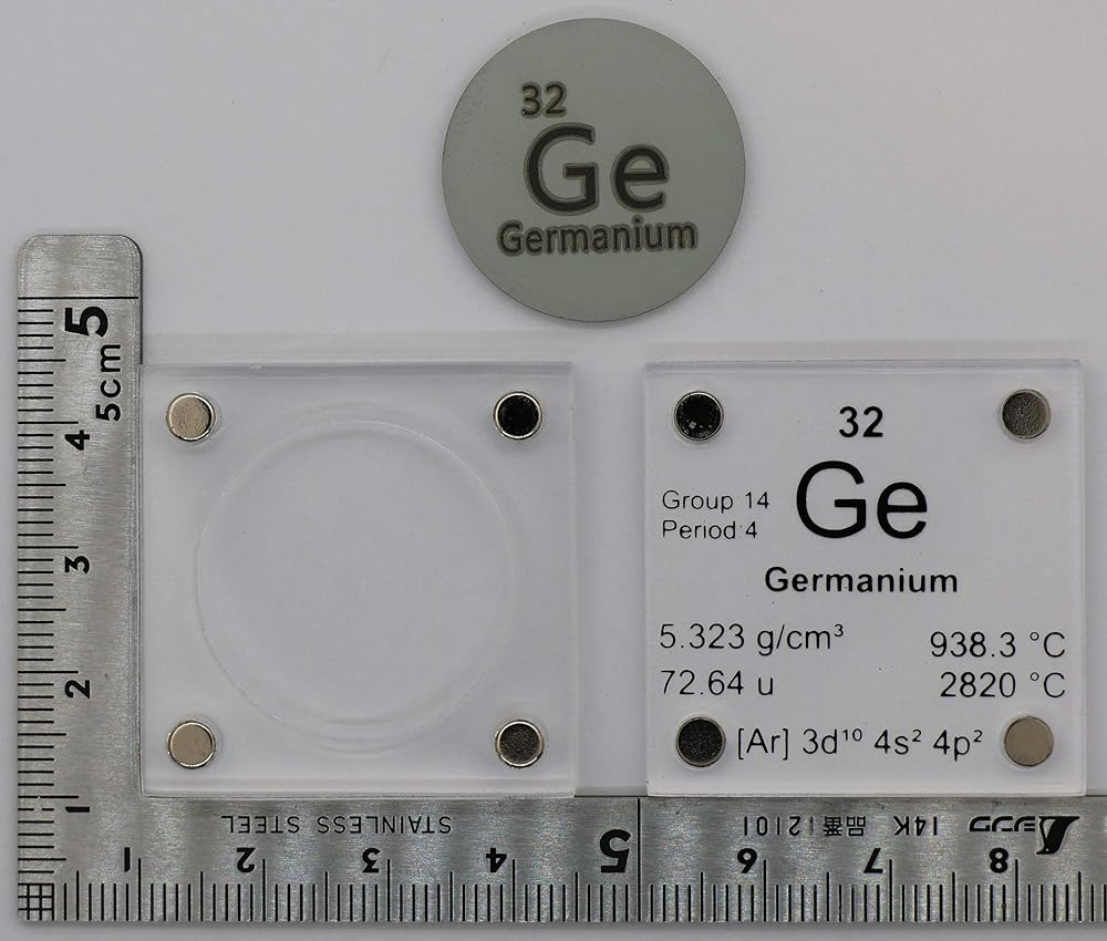 Germanium is a chemical element with symbol Ge and atomic number 32. It is a lustrous, hard, grayish-white metalloid in the carbon group, chemically similar to its group neighbors tin and silicon. Pure germanium is a semiconductor with an appearance similar to elemental silicon. Like silicon, germanium naturally reacts and forms complexes with oxygen in nature. -Wikipedia Quarter and scale not included