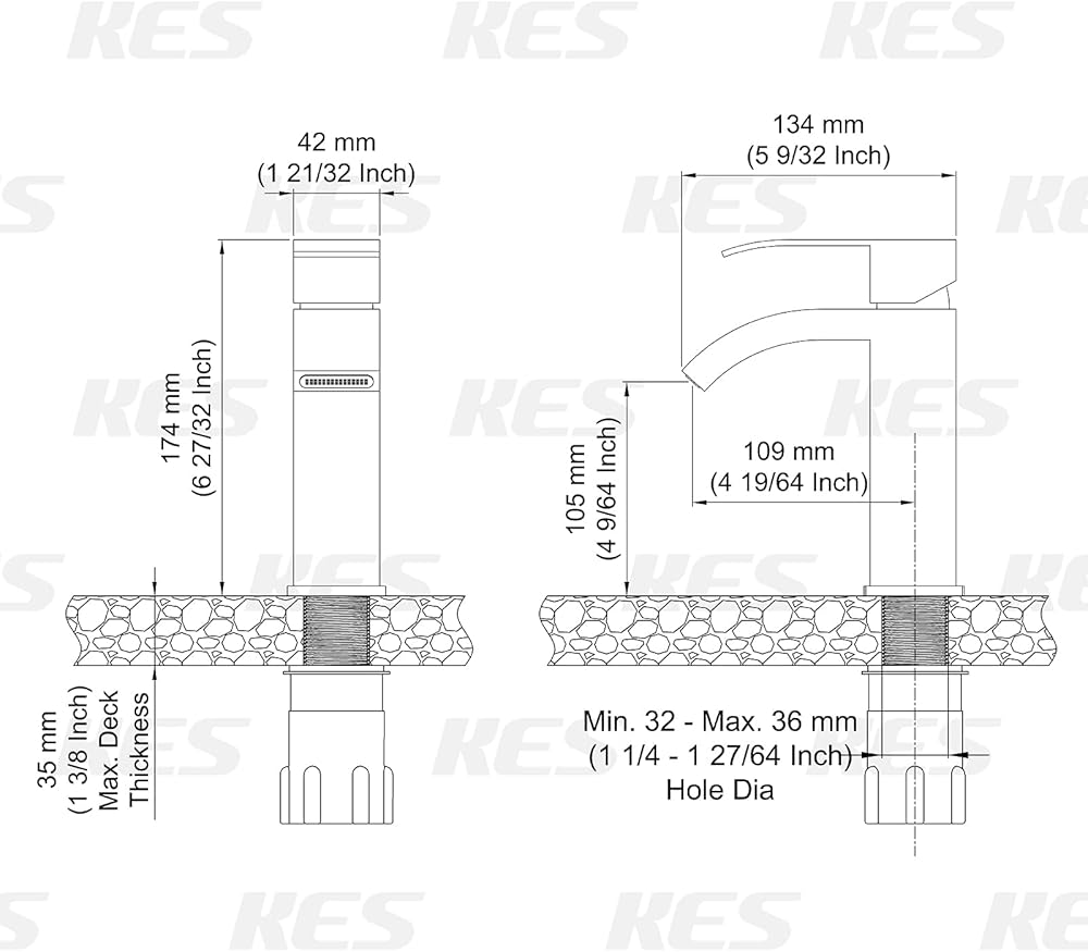 سهولة التركيب: توفر KES جسم مقبض من قطعة واحدة لسهولة التركيب. قطر فتحة التركيب: 1.26 بوصة إلى 1.42 بوصة، بحد أقصى. سُمك العداد: 1.38 بوصة، وصول الفوهة: 4.2 بوصة، ارتفاع الفوهة: 4.13 بوصة. تتضمن خراطيم إمداد المياه وأدوات التركيب والتعليمات.