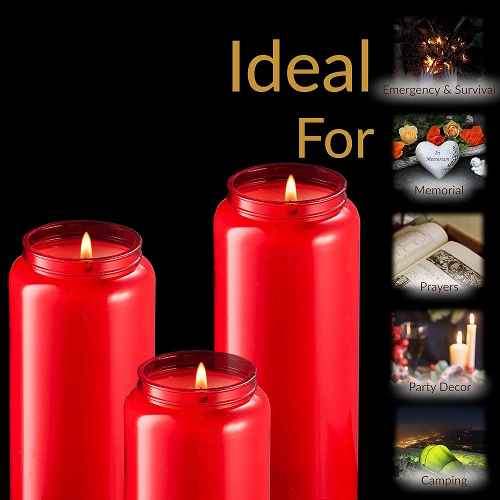 • FOR SURVIVAL, DECORATING: Popular among Catholics, Jewish members of faith & survivalists alike, our no glass red candle can be used as a red candle for protection, emergency survival candle or prayer candle.