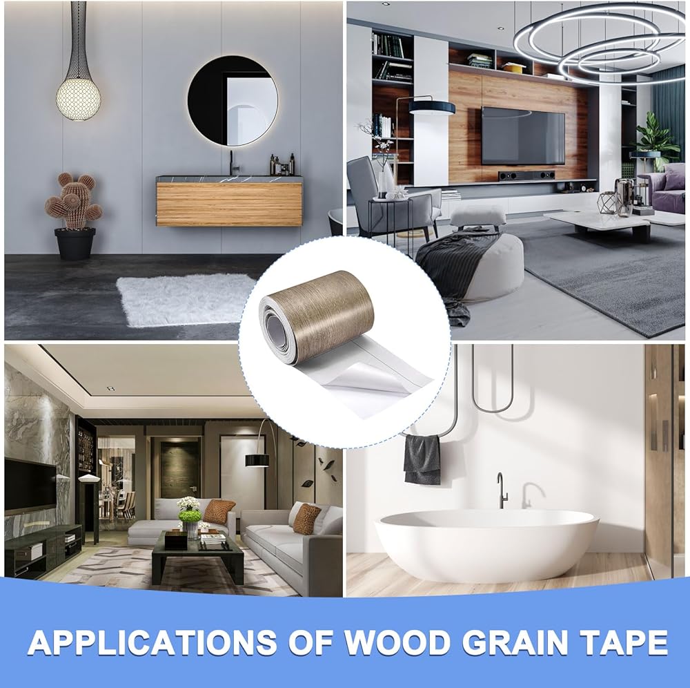 √ Imitation wood grain repair tape is a repair material with an imitation wood grain effect, self-adhesiveness, and durability. Suitable for baseboard repair, furniture renovation, cabinets, doors and window, floor repair, decoration projects, and daily DIY.