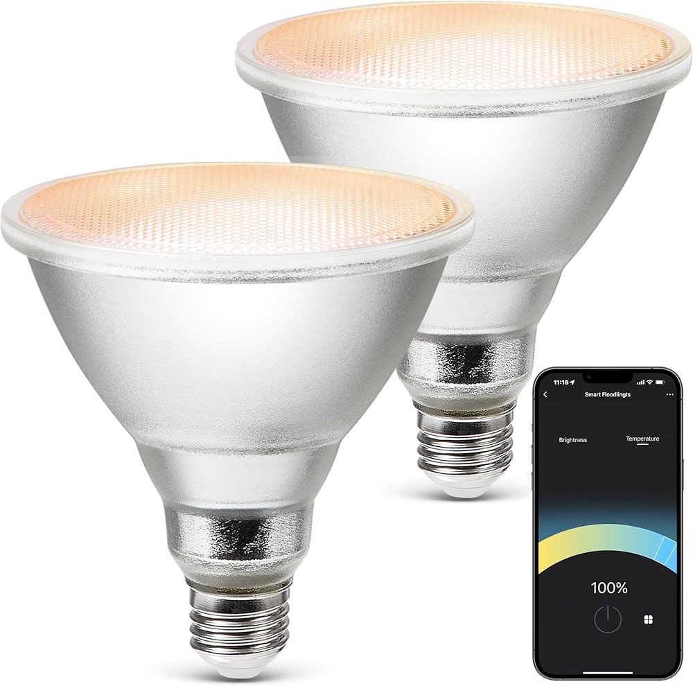 مصباح Geeni LUX الذكي، أبيض - مصباح LED خارجي 2700K-6500K، E26، PAR38، 11 وات، 1000 لومن - لا حاجة إلى محور - متوافق مع Alexa، Google Home، يتطلب واي فاي 2.4 جيجا هرتز، عبوتان