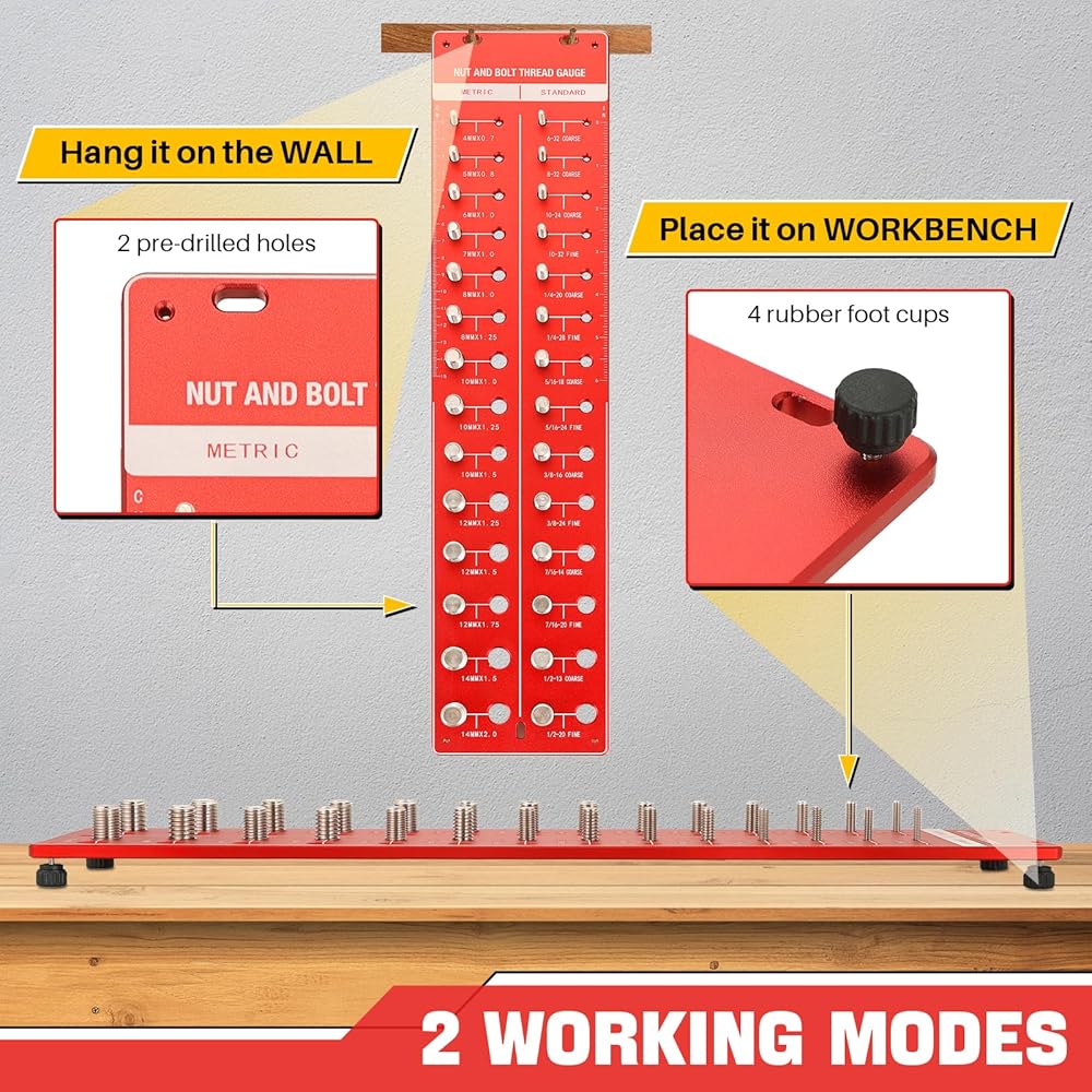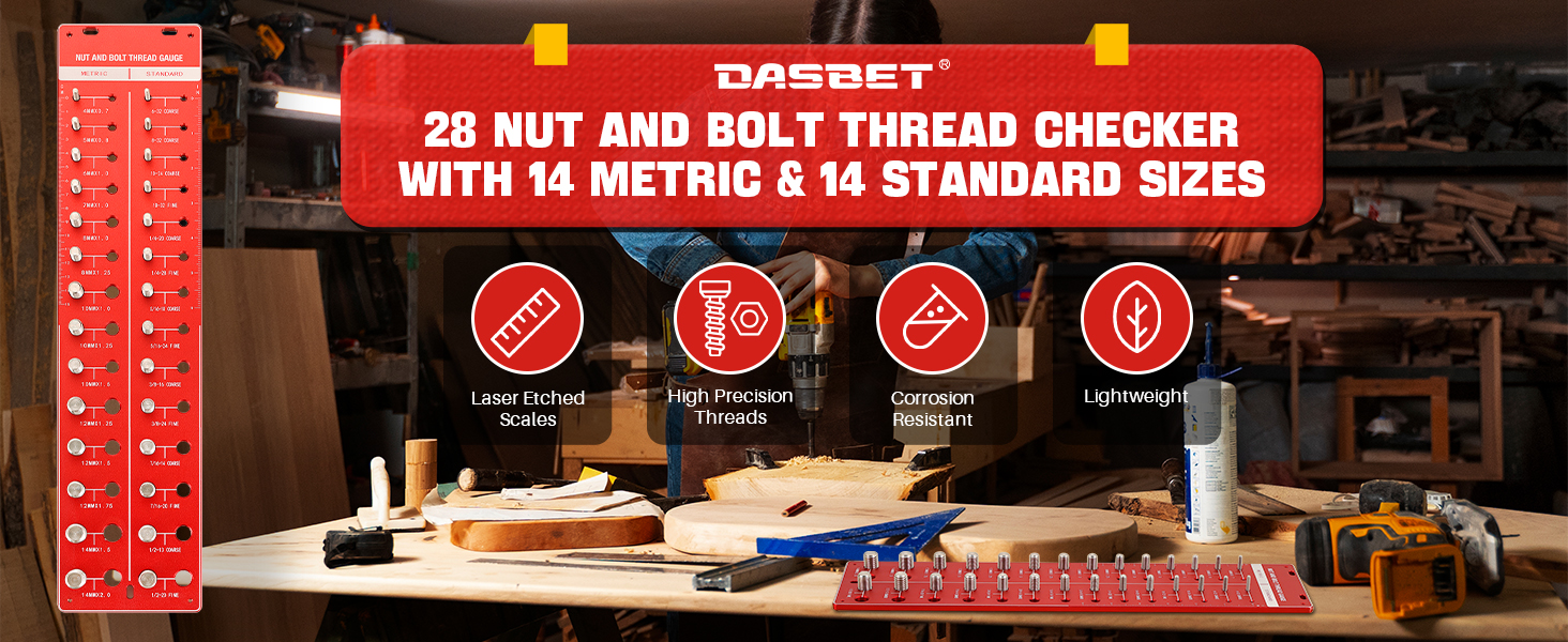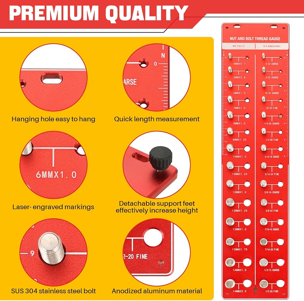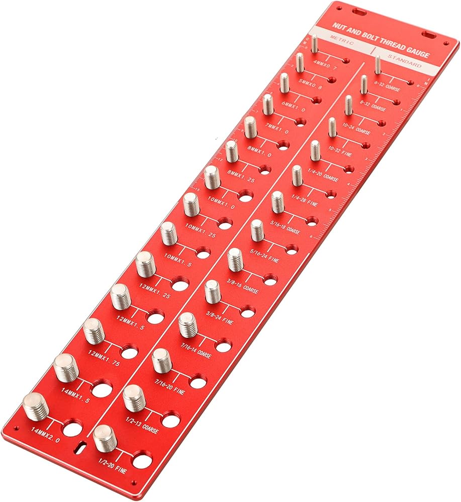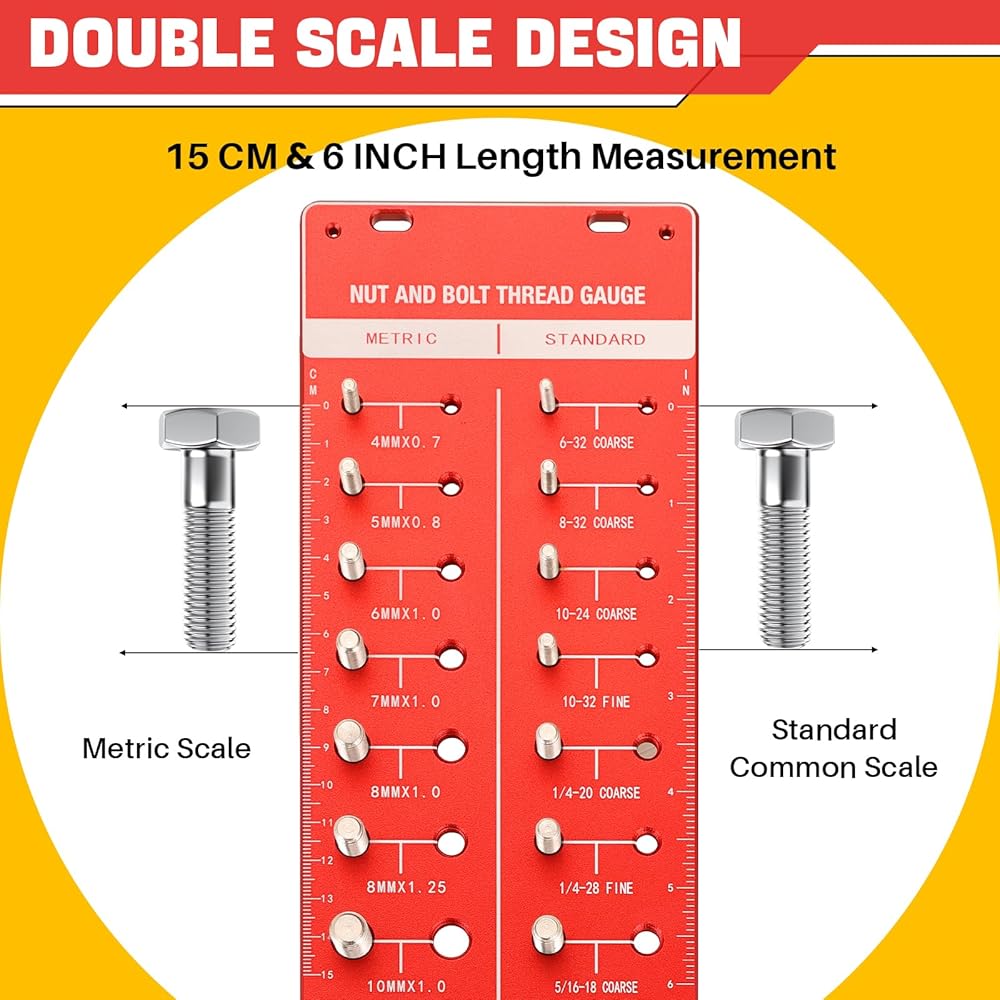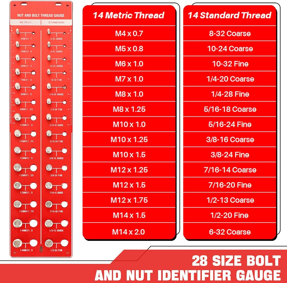 مدقق خيط صامولة ومسمار DASBET 28 مدقق خيط، حجم الخيط مدقق حجم الترباس ومقياس الخيط مع 14 معيار و 14 مقياس متري ومعرف الجوز مع مسطرة بوصة وسنتيمتر، أحمر