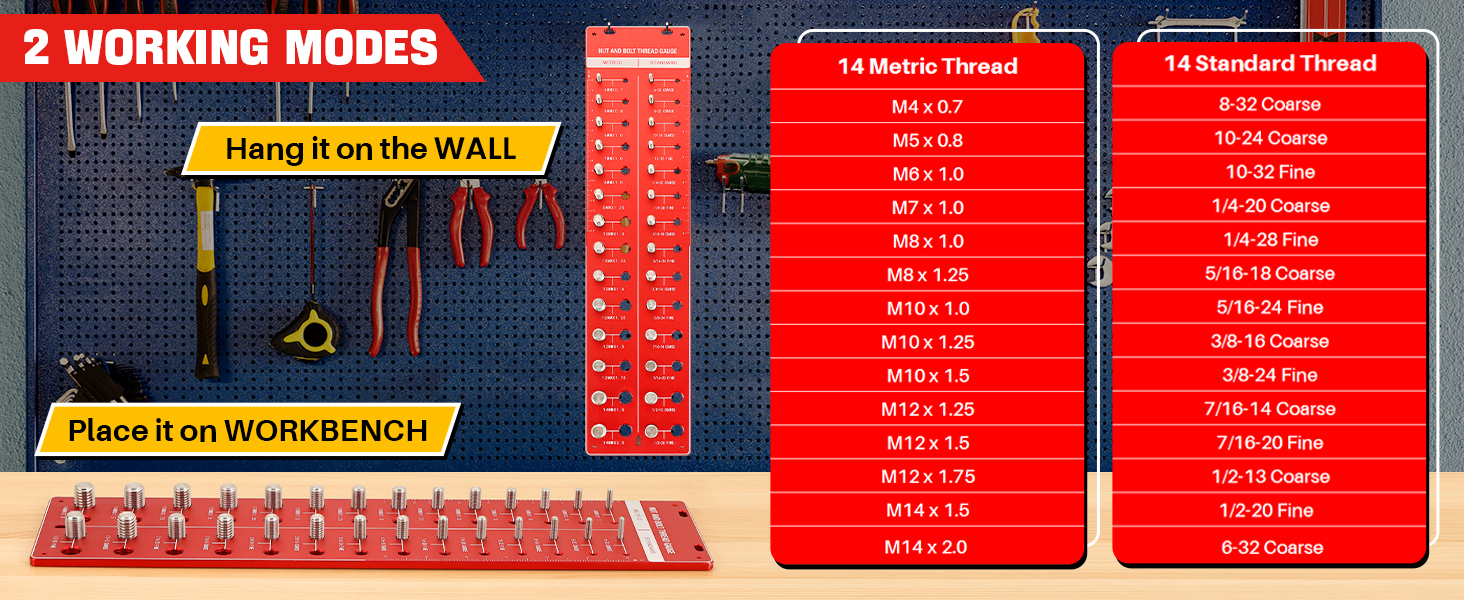 • فاحص الخيط الأساسي: يعد فاحص حجم الخيط أداة أساسية للمحترفين وعشاق الأعمال اليدوية على حد سواء، ويساعد على تنظيم البراغي والصواميل الفوضوية. بفضل التصميم المتكامل وفتحات التثبيت المعدة، فإنه يضمن الراحة وسهولة الاستخدام، سواء تم تركيبه على الحائط أو على صندوق الأدوات. يقدم كلاً من معايير SAE ومقاييس الخيوط المترية، ويصبح رفيقًا لا غنى عنه لمختلف المهنيين بما في ذلك ميكانيكا السيارات والنجارين واللحام والسباكين والمهندسين الميكانيكيين وعشاق إصلاح السيارات وفنيي الورش.