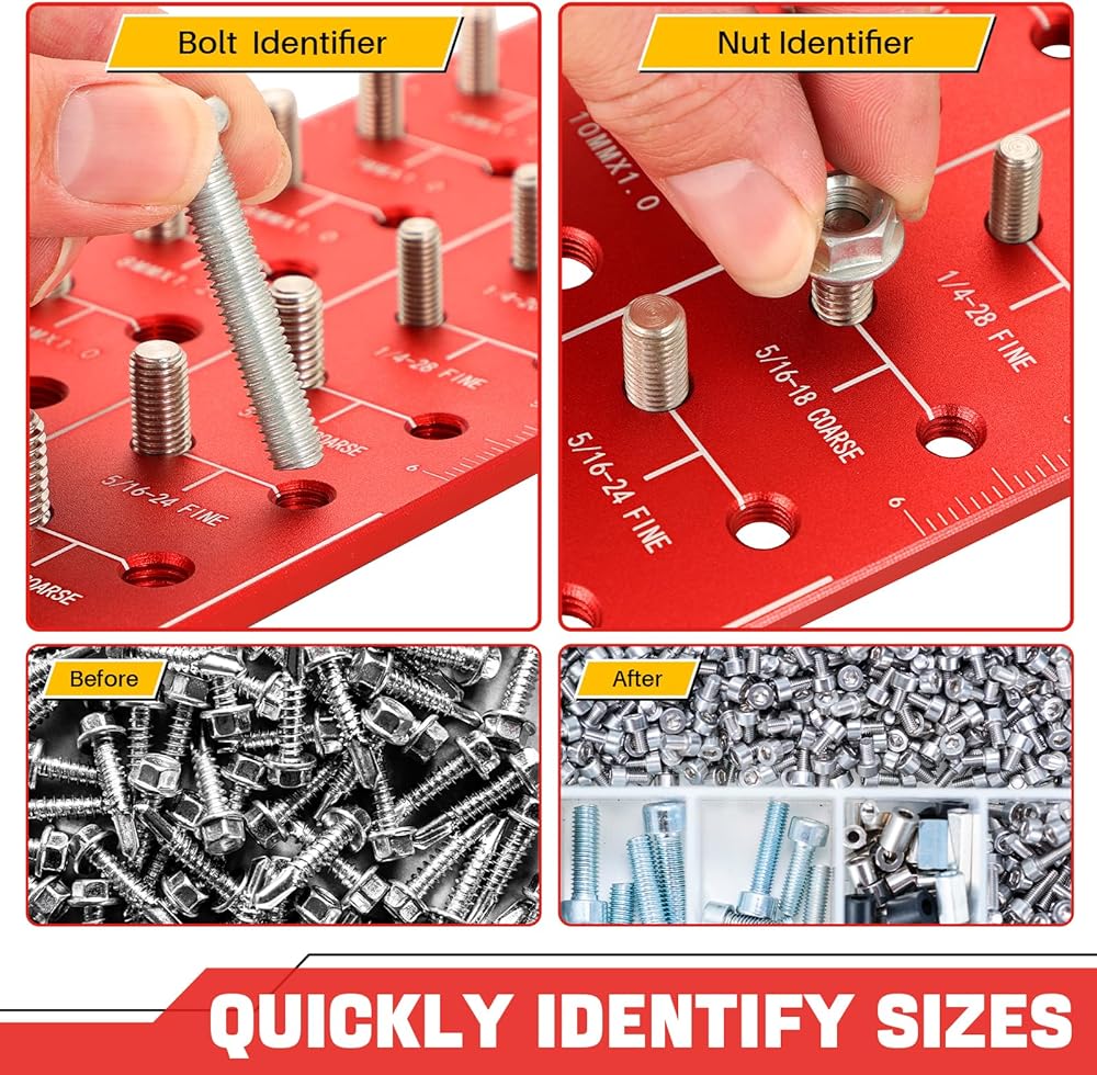 • علامات سهلة القراءة: يتميز حجم المسمار ومقياس الخيط الخاص بنا بمقاييس متينة محفورة بالليزر على الحافة، مما يوفر تحديدًا سريعًا ودقيقًا وسهلاً لأحجام الخيوط المختلفة، وقد تم تصميم لوحة تعريف المسمار بحروف بيضاء على خلفية حمراء ، سهلة القراءة.