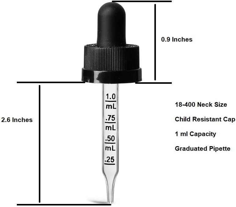 • 1 ml Capacity graduated droppers are made of clear glass and easy to see through, 0.25 ml, 0.50 ml, 0.75 ml and 1 ml scale clearly marked