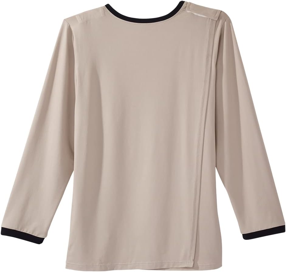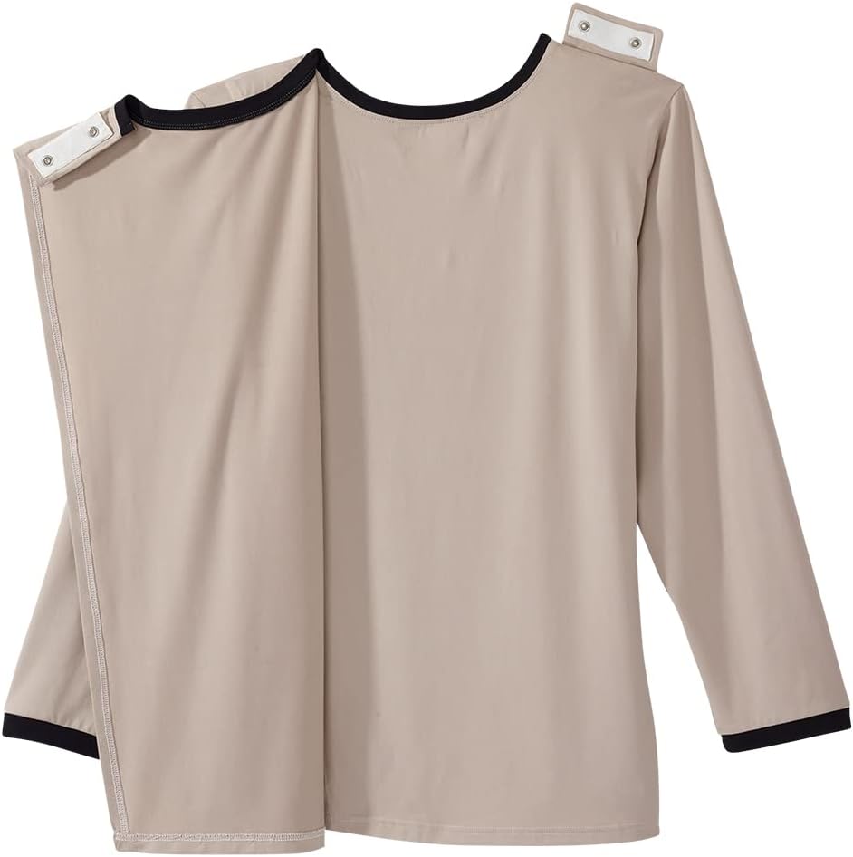 فستان مفتوح الظهر: بفضل حلول ارتداء الملابس المفتوحة الظهر الأكثر أمانًا مع أزرار كبس على الأكتاف، فإن هذا الجزء العلوي مفتوح الظهر مثالي للارتداء الذاتي لأي شخص يعاني من انخفاض حركة الجزء العلوي من الذراع. هذه القمصان المخصصة للنساء المسنات مفتوحة بالكامل من الخلف، لذلك يمكن للأفراد إدخال أذرعهم بسهولة في أكمام ملابس مريحة دون المعاناة من فتحات الرقبة الصغيرة أو الاضطرار إلى رفع أذرعهم.