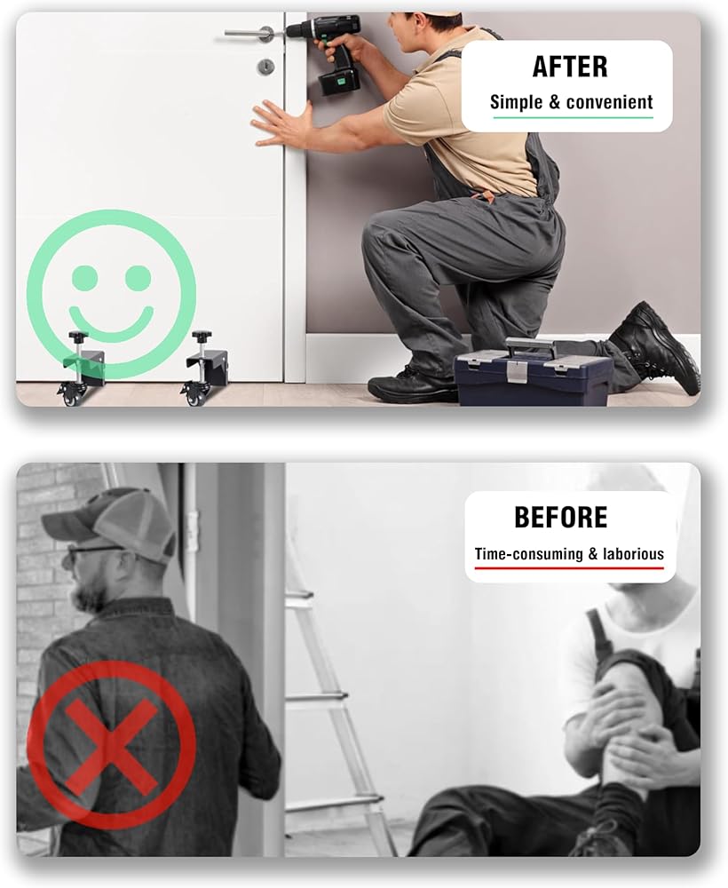 【حرة اليدين والاستخدام بسهولة】: بمجرد وضعها على الأرض، تسمح ميزة التثبيت المستقلة لتركيب الباب بلف الأبواب وتعليقها بسهولة. أصبح من السهل تحريك الباب المستقر في موضعه نحو دعامة الباب ومحاذاة المفصلات بسرعة ودقة دون مساعدة