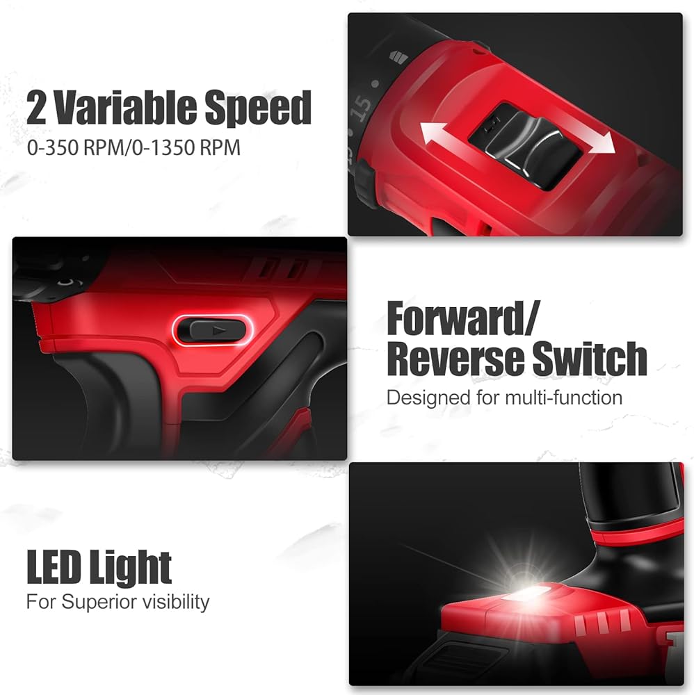 مثقاب كهربائي بسرعتين: احصل على تحكم أكبر في المثقاب/السائق اللاسلكي ببطارية ليثيوم أيون مع علبة تروس محسنة بسرعتين (0-350 دورة في الدقيقة / 0-1350 دورة في الدقيقة) و16 إعدادًا مختلفًا لعزم الدوران متاح للاستخدام مع الحد الأقصى 320 رطلًا يمكن لعزم الدوران الحفر بسهولة عبر الخشب والمعادن والبلاستيك والمواد الأخرى