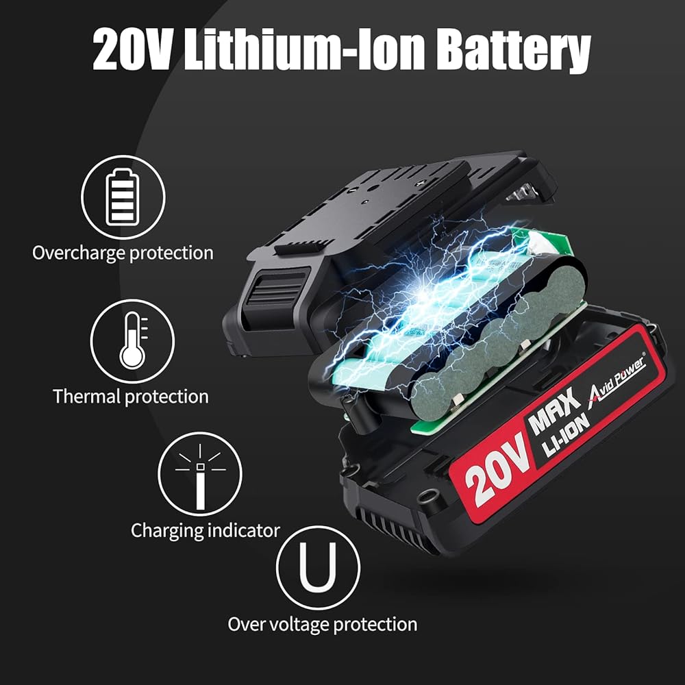 حزمة بطارية قوية: يتم تزويد مجموعة المثقاب اللاسلكي Avid power 20V ببطارية ليثيوم أيون قوية تسمح بمزيد من الطاقة ووقت تشغيل أكبر بنسبة تصل إلى 25% من البطارية القياسية، بدون تفريغ ذاتي، وجاهزة دائمًا للاستخدام