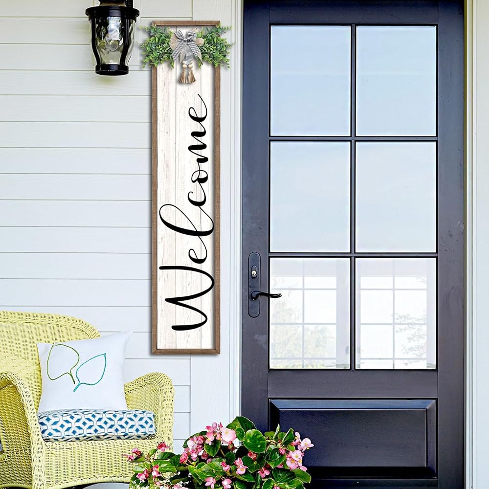 【مادة عالية الجودة】: علامة الترحيب العمودية المعلقة للشرفة الأمامية مصنوعة من مواد خشبية طبيعية وعالية الجودة، متينة وموثوقة في الاستخدام، وهي مطبوعة بأحبار الأشعة فوق البنفسجية المقاومة للطقس والتي لن تبهت أو تتقشر أو تتشقق.