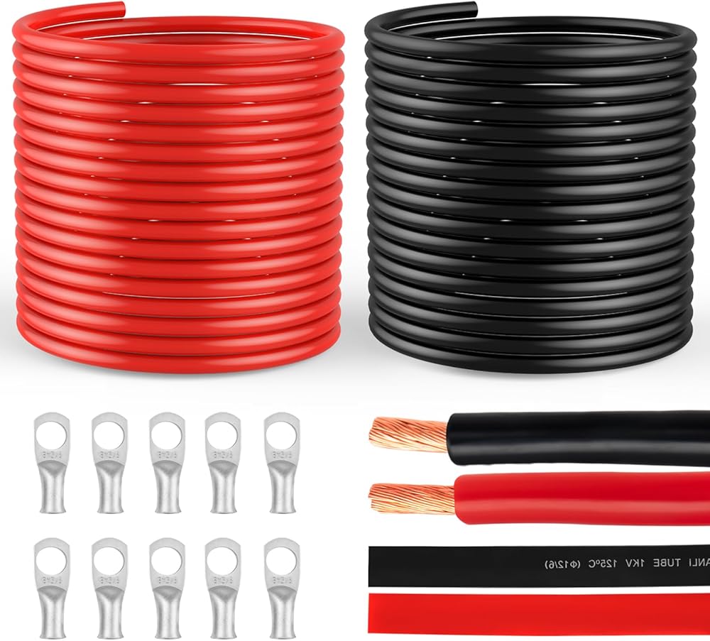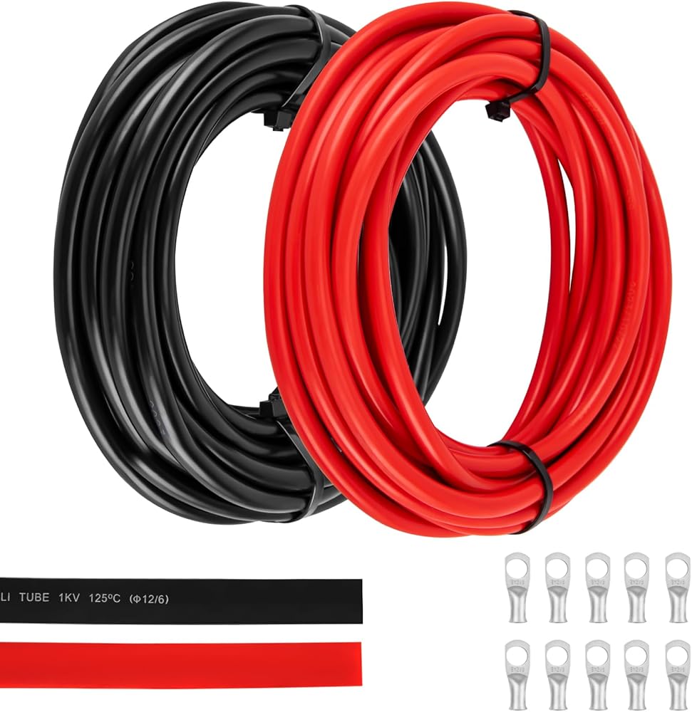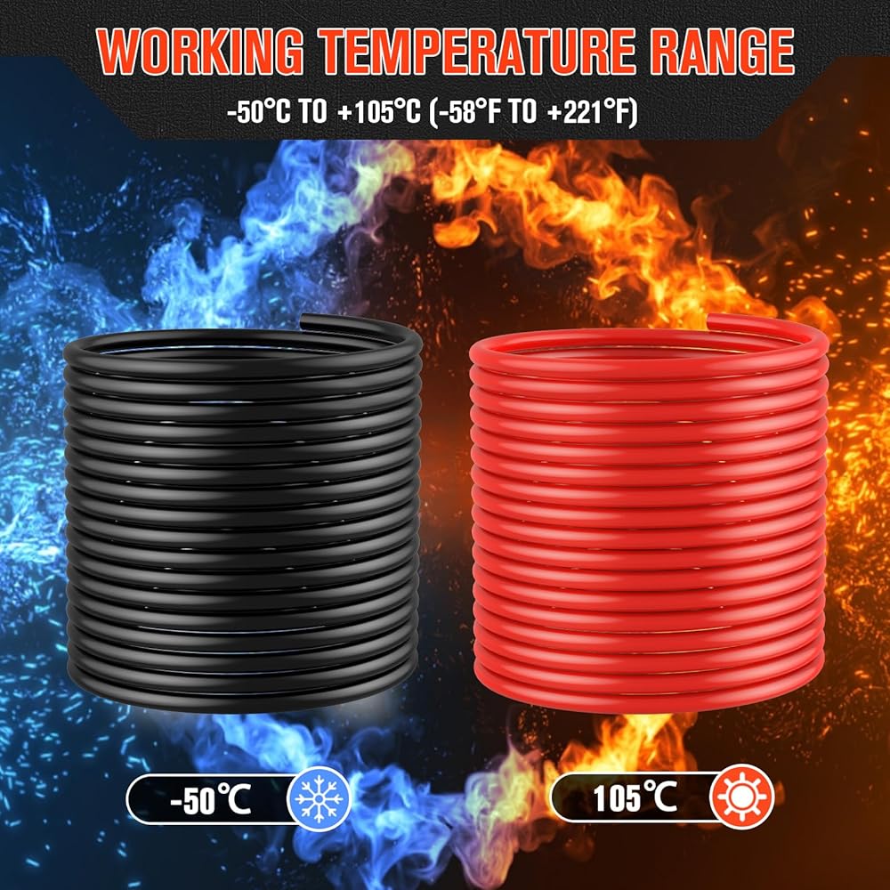 • تتضمن العبوة سلك نحاسي بطول 20 قدم أحمر و20 قدم أسود 6 AWG، القطر الخارجي: 8 مم، 10 قطع 6 3/8 بوصة، أنبوب انكماش حراري أسود 12 بوصة و12 بوصة أحمر.