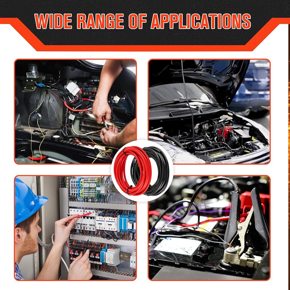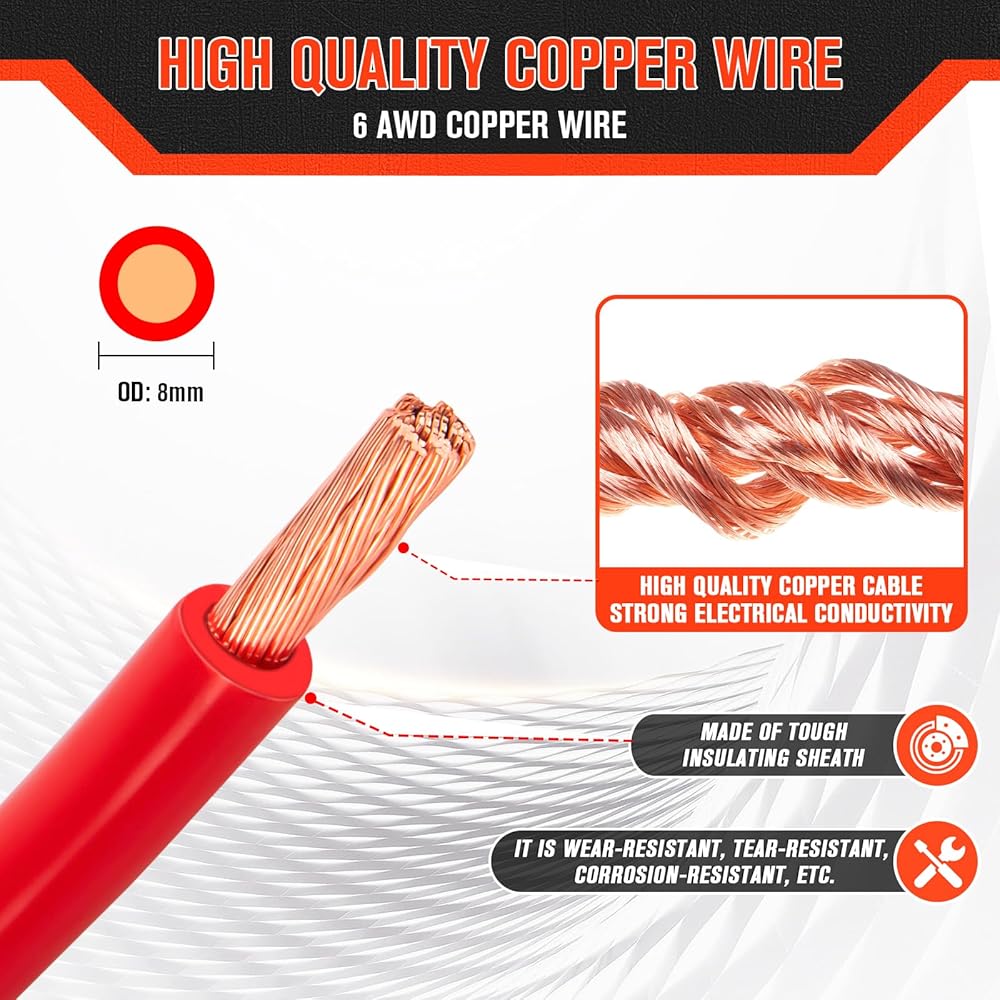 • 【كابل 6 AWG متعدد الاستخدامات】كابلات نحاسية عالية الجودة 6 AWG لأي نوع من السيارات، وأنظمة الطاقة الشمسية، والمولدات، وما إلى ذلك، كبديل لكابلات السيارات والبحرية. مثالي لتطبيقات التيار المستمر التي تتضمن بطاريات عالية الجهد، حيث يوصى بالنحاس النقي