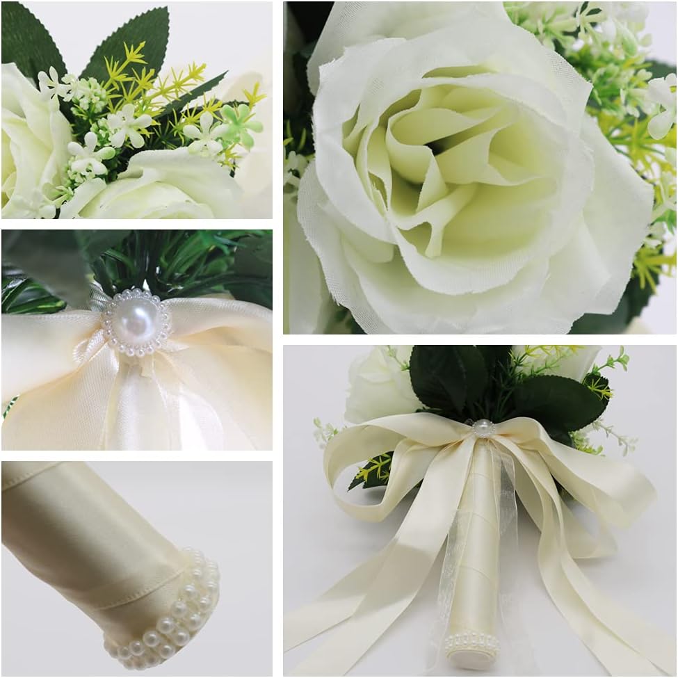 【حيوية】 باقات وصيفات العروس لحفلات الزفاف ذات الشريط الناعم واللؤلؤ جميلة جدًا وجميلة، وذات ملمس رقيق وناعم، وزهور كاملة وثلاثية الأبعاد، وإحساس قوي بالطبقة، مقارنة بالزهور الحقيقية.