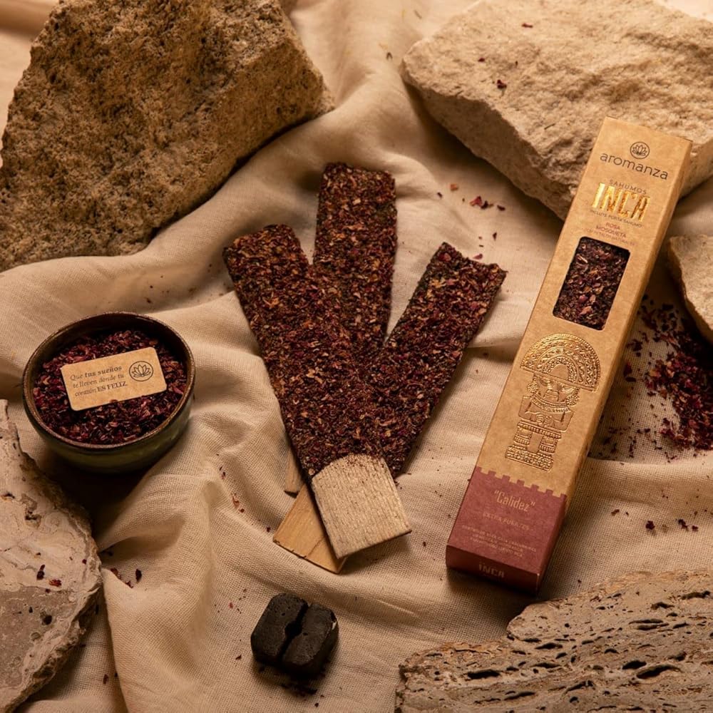 بخور الإنكا الفاخر. مستدامة بنسبة 100%. علاجي. عضوي. يدويا. 3 وحدات. (ثمر الورد/بالو سانتو)