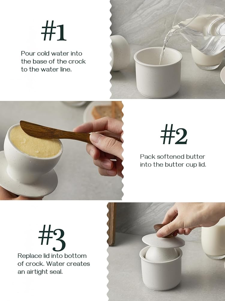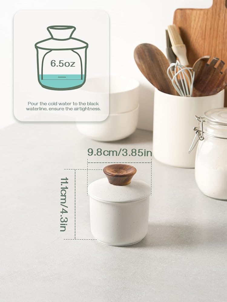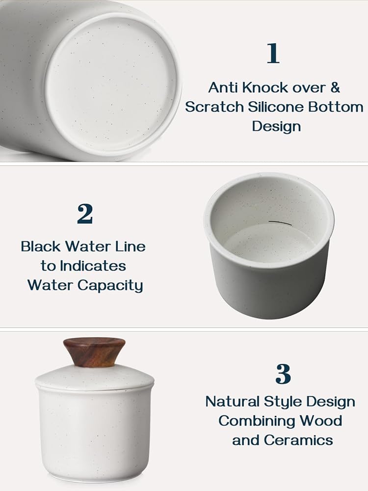 سهل الاستخدام وسهل الغسل: يأتي الفخار مع خط تعبئة من الداخل للمياه مما يجعل إغلاق محكم، لا مزيد من التخمين. يتطلب الحد الأدنى من العناية، ويمكن غسله جيدًا في غسالة الأطباق. قم بتغيير الماء كل يوم أو كل 2-3 أيام. يحافظ على الزبدة طازجة لمدة شهر. لمزيد من المعلومات حول كيفية استخدامه، راجع الوصف التفصيلي في هذه الصفحة.