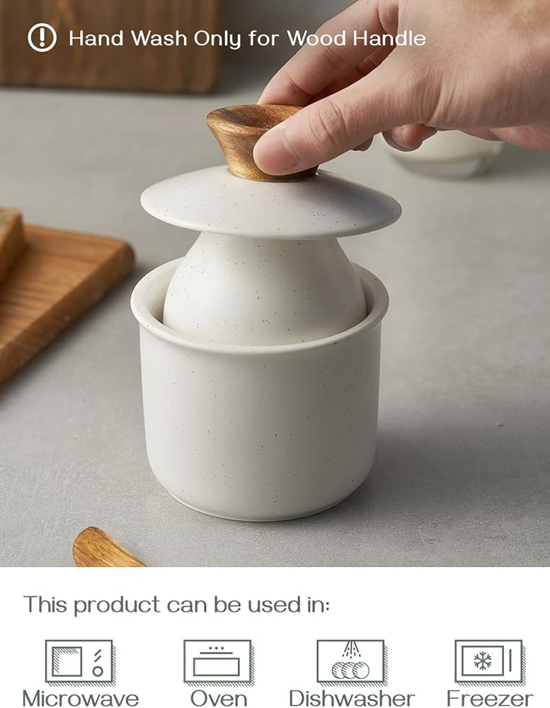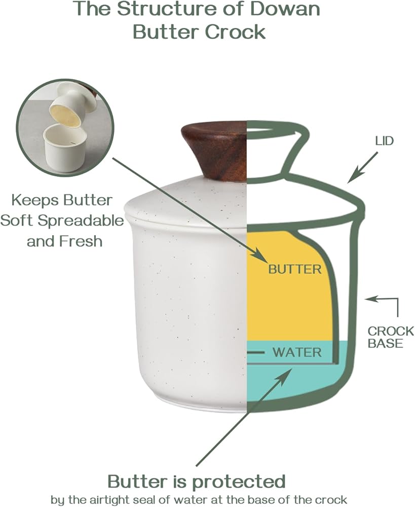 زبدة طازجة وناعمة جاهزة في متناول اليد في جميع الأوقات: لا مزيد من الزبدة الباردة من الثلاجة. يحافظ هذا الوعاء على زبدتك ناعمة وقابلة للتوزيع للاستخدام على اللفائف والخبز والخبز المحمص والفطائر والفطائر وأكثر من ذلك، دون وجود فوضى لزجة على طبق في مكان ما. استمتع بالزبدة بدرجة حرارة الغرفة في الصباح.