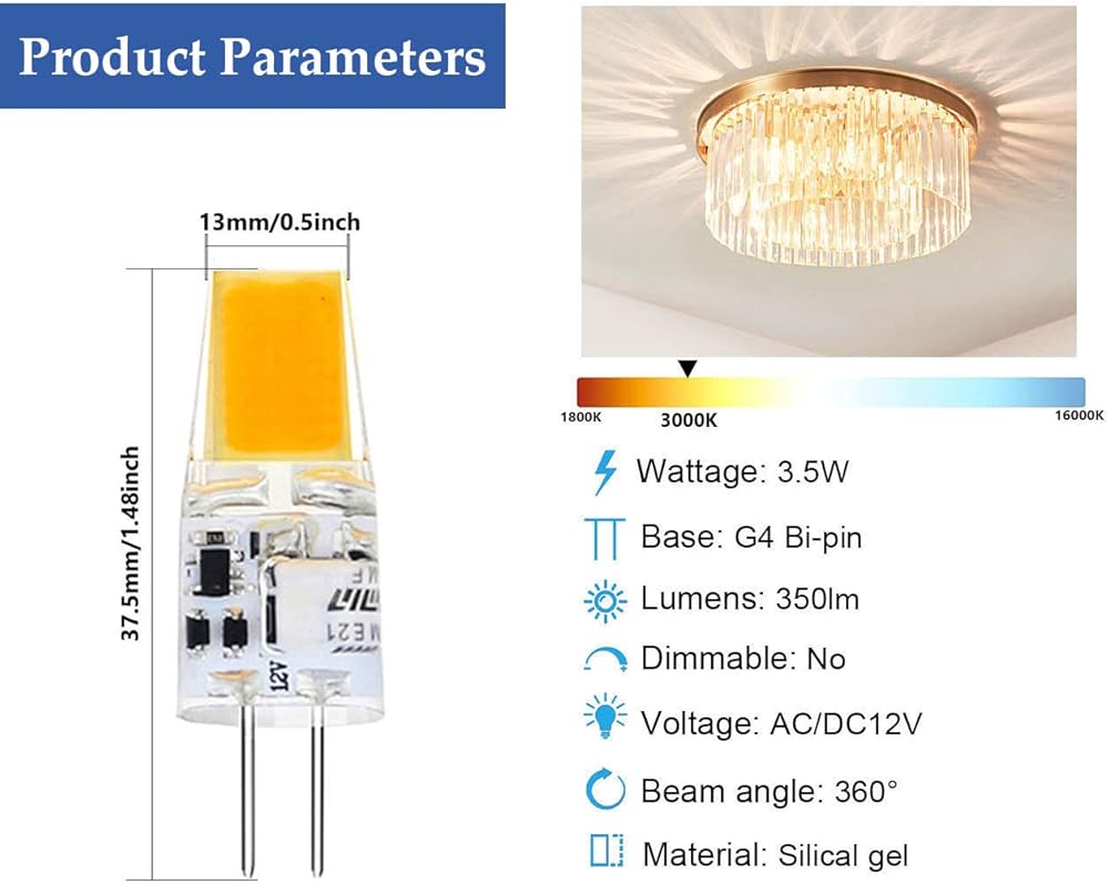 • حجم الملاحظة: يبلغ مقاس لمبة LED البيضاء الدافئة G4 3W 12.6 × 36.6 مم/0.5 × 1.44 بوصة، وهي أطول من مصابيح الهالوجين G4 القديمة، يرجى التحقق من أبعاد التركيبات قبل الشراء.