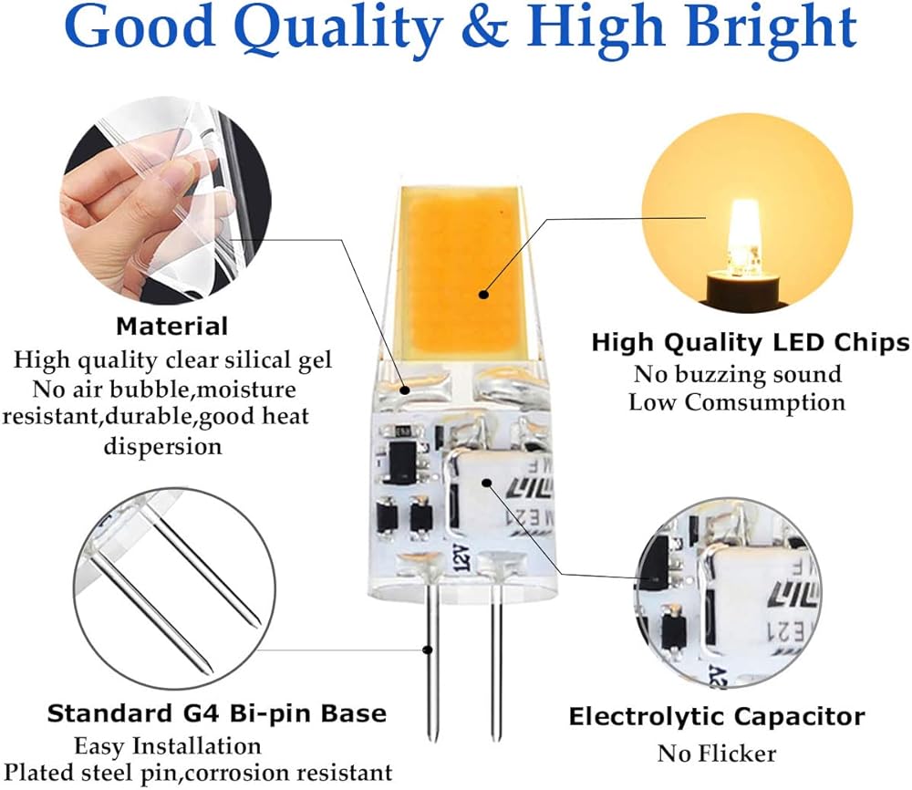 • 【وفر فاتورة الكهرباء】مصباح G4 LED 3 وات ساطع بما يكفي لاستبدال مصابيح الهالوجين 20 وات 25 وات 30 وات g4، مما يوفر أكثر من 90% من الطاقة والمال. يضمن تبديد حرارة هلام السيليكا الأفضل عمرًا أطول للمصابيح، مما يوفر تكلفة الصيانة.