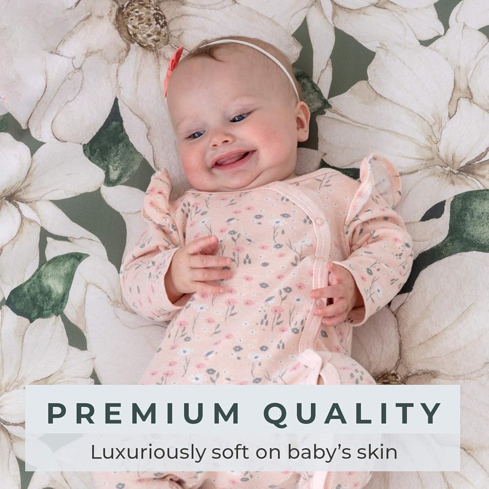 ► ينام الأطفال الرضع لمدة تصل إلى 16 ساعة يوميًا، لذا من المهم أن تختاري ملاءات لطيفة على بشرة طفلك. نحن نستخدم مزيجًا من القطن/الإسباندكس عالي الجودة لتوفير أقصى درجات النعومة والتهوية لطفلك.