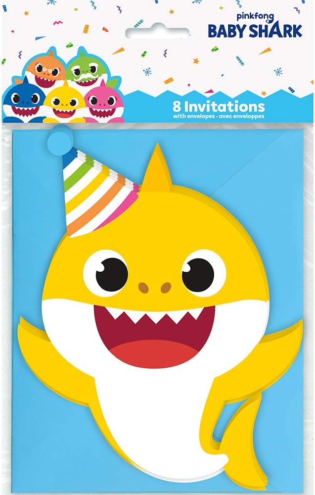 على شكل قرش يرتدي قبعة حفلة، ستمنح دعوات بيبي شارك ضيوف السباحة في حفلتك مع الإثارة! مع لوازم الحفلات بيبي شارك الخاصة بنا، سوف تجتمع حفلة عيد ميلاد أطفالك معًا أسرع مما يمكنك قوله، دو دو ودو! انغمس في مجموعتنا الكاملة من الديكورات وهدايا الحفلات وأدوات المائدة! تشتمل على مغلفات.