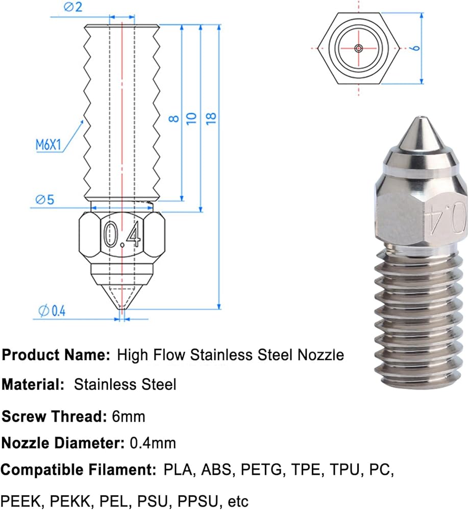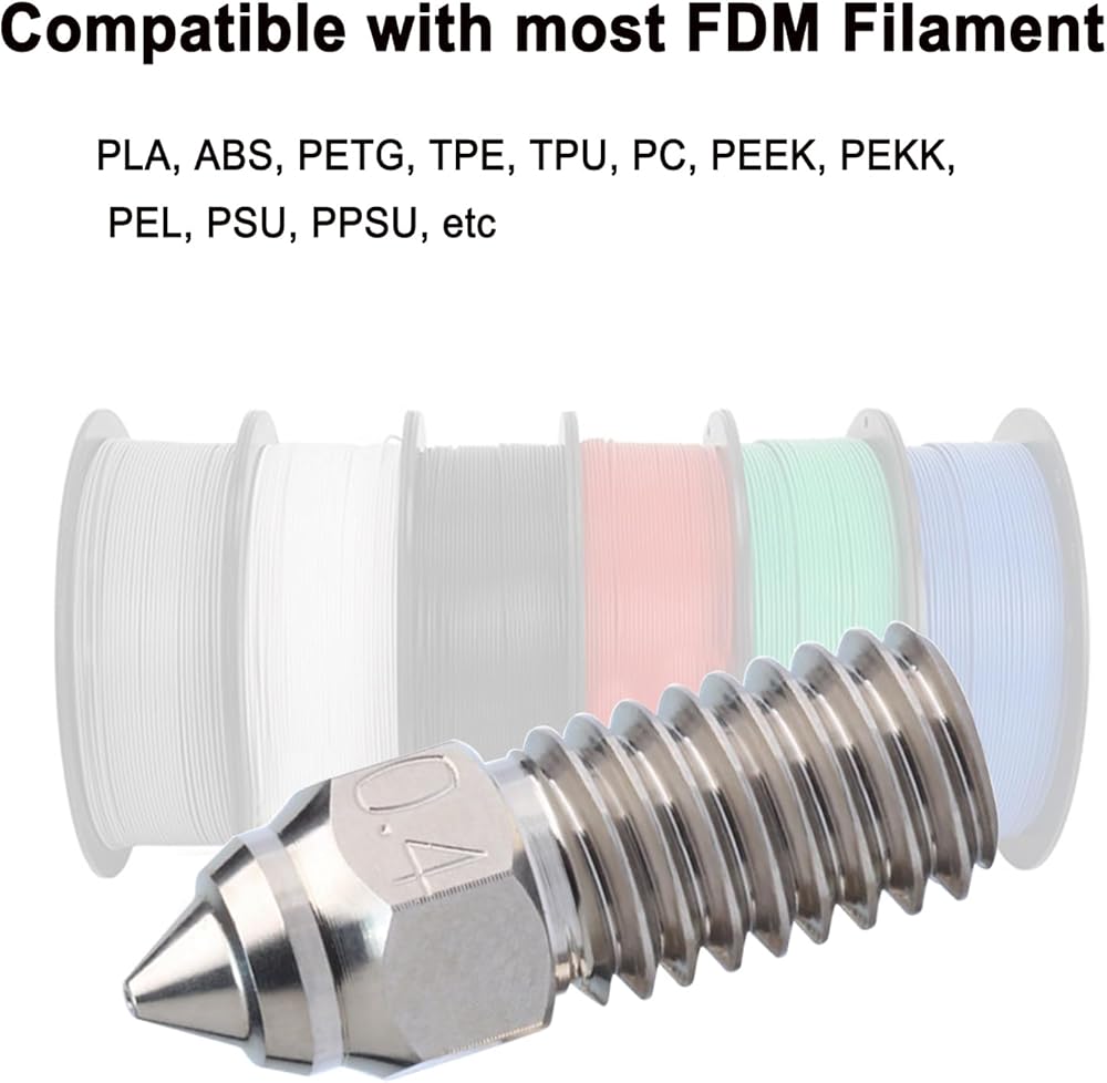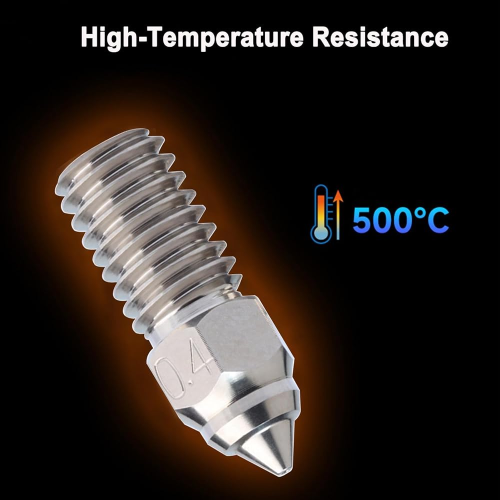 • High-Temperature Resistance: The max temp of this stainless steel nozzle could reach 500c, suitable for 3D printing at high temperatures, It is Suitable for most 1.75mm FDM materials such as PLA, ABS, PETG, TPE, TPU, PC, etc., as well as high-temperature consumables such as PEEK, PEKK, PEL, PSU, PPSU, etc
