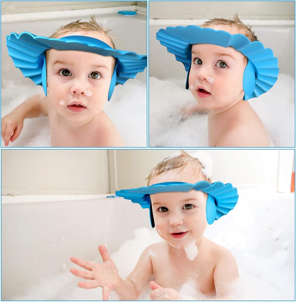 • قبعة واقية لغسل شعر الأطفال رائعة لمنع الشامبو والماء من الدخول إلى أذني طفلك أو عينيه أو فمه والسماح لطفلك أن يقع في حب الاستحمام. كما أنه رائع لتشذيب الشعر.