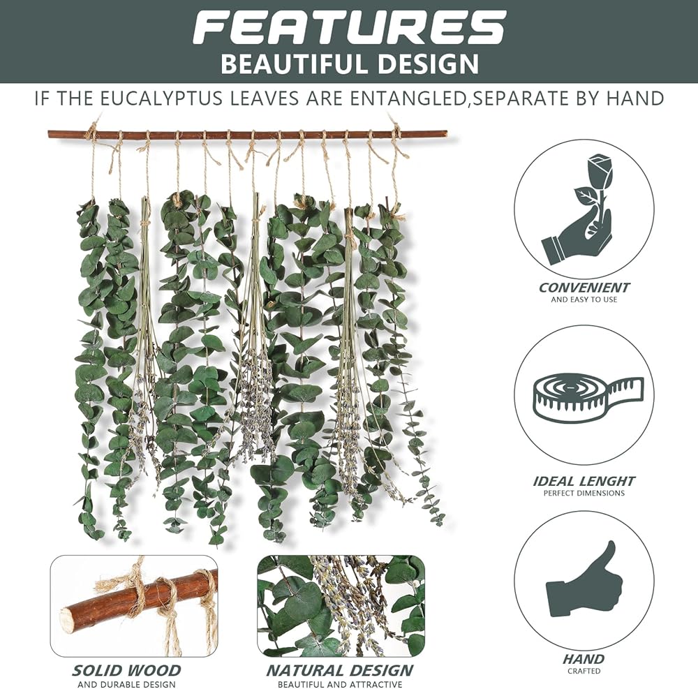 مواد فاخرة: الأوكالبتوس عالي الجودة مختار من الطبيعة، والسيقان متينة، ولا يمكن أن تنكسر بسهولة. يمكن تخزينها إلى الأبد دون القلق بشأن تسوسها وذبولها. مصنوعة بشكل رائع، متصلة بخيط الجوت الطبيعي، تظهر النمط الطبيعي والطازج والبوهو تماما.