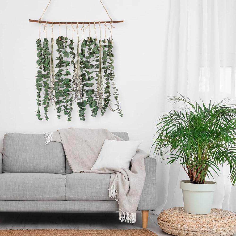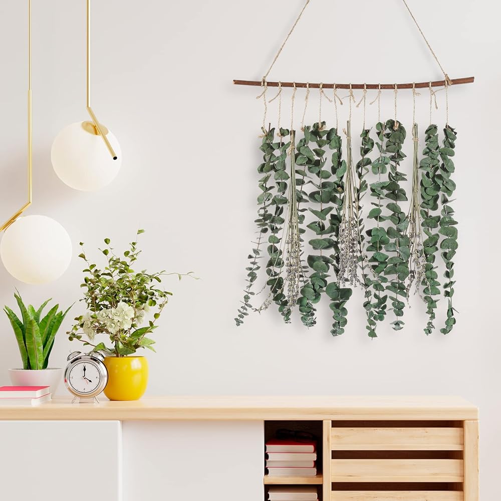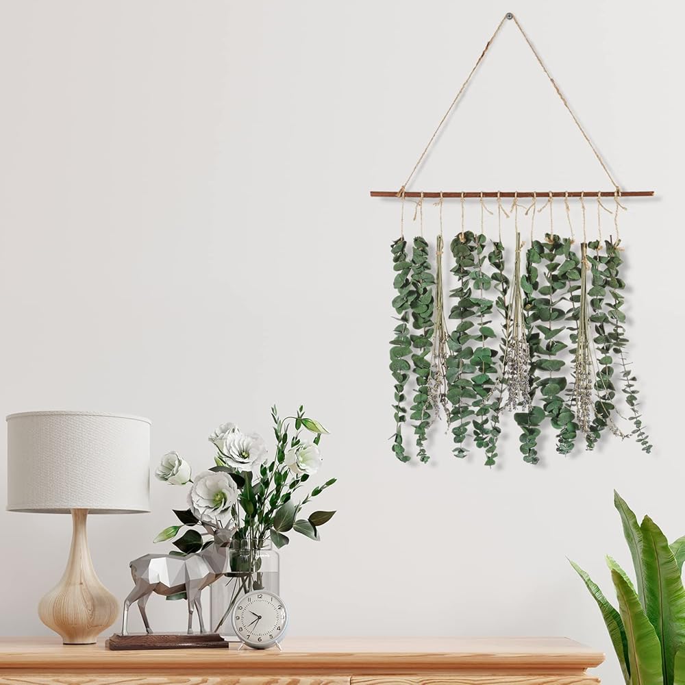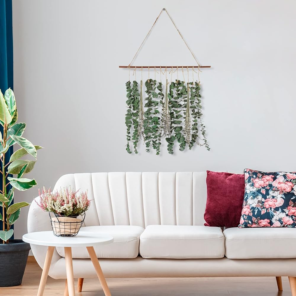 ديكور جدار بوهو: سيقان الأوكالبتوس الجميلة التي ستبقى بمظهر جديد سنة بعد سنة. لن يبهت أو يذبل. ويمكنك إضافة إحساس بوهيمي أو مزرعة أو أزياء إلى منزلك. اجلب الهدوء والسكينة للطبيعة إلى منزلك. سواء في الحمام أو المطبخ أو غرفة المعيشة أو غرفة النوم، فهو ديكور جيد.