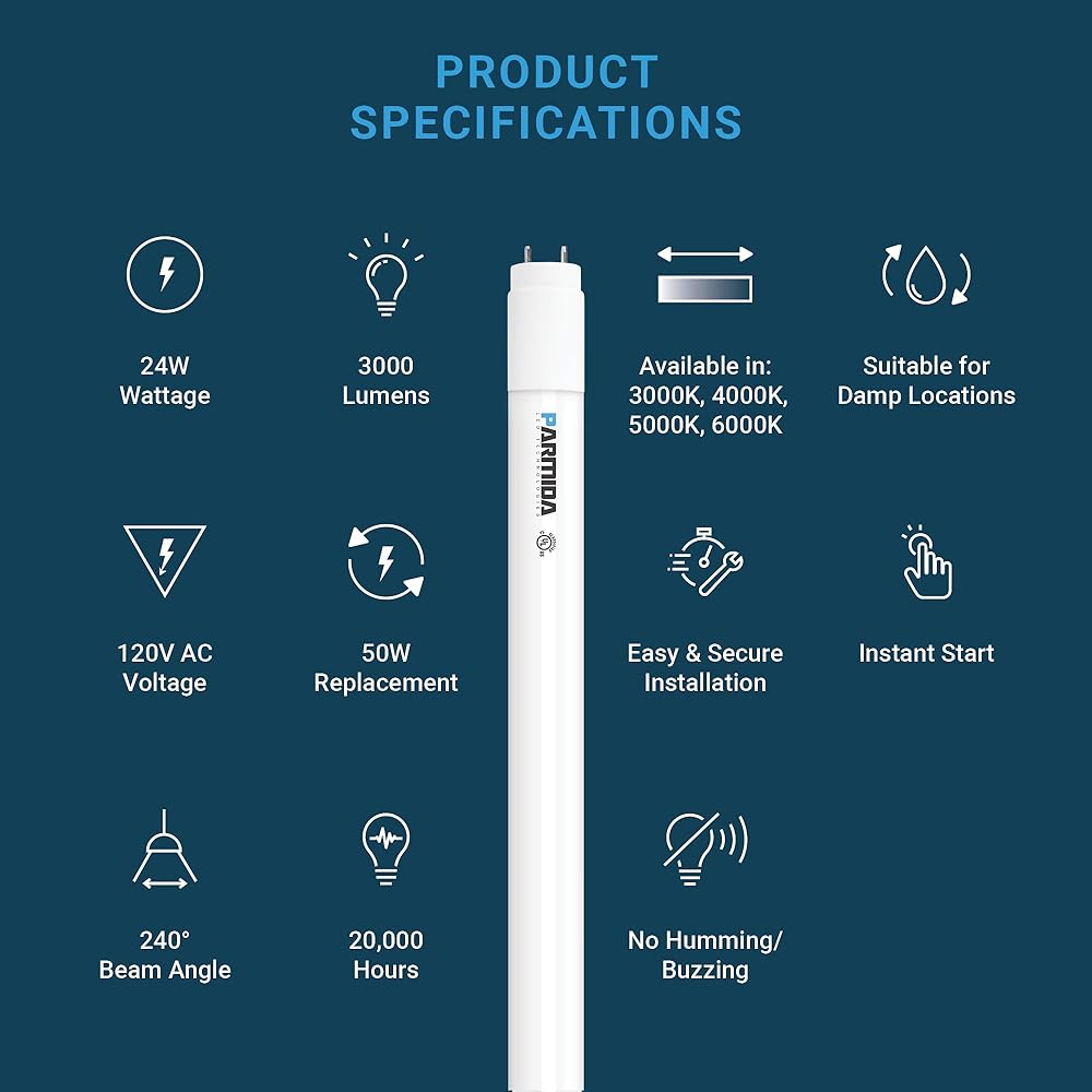 توفير الطاقة، والإضاءة الساطعة: استبدال الفلورسنت (T8، T10، T12) سيوفر لك الوقت والمال لأن كوابح الكوابح ستفشل حتمًا بمرور الوقت وستتطلب الاستبدال. تستهلك الكوابح أيضًا الطاقة الكهربائية، ومن خلال تجاوزها ستوفر المزيد من فاتورة الطاقة الخاصة بك. تستخدم هذه المصابيح 24 واط فقط لإصدار 3000 لومن (ما يعادل 55 واط في أنابيب الفلورسنت)، مما يجعلها أكثر سطوعًا وكفاءة في استخدام الطاقة.