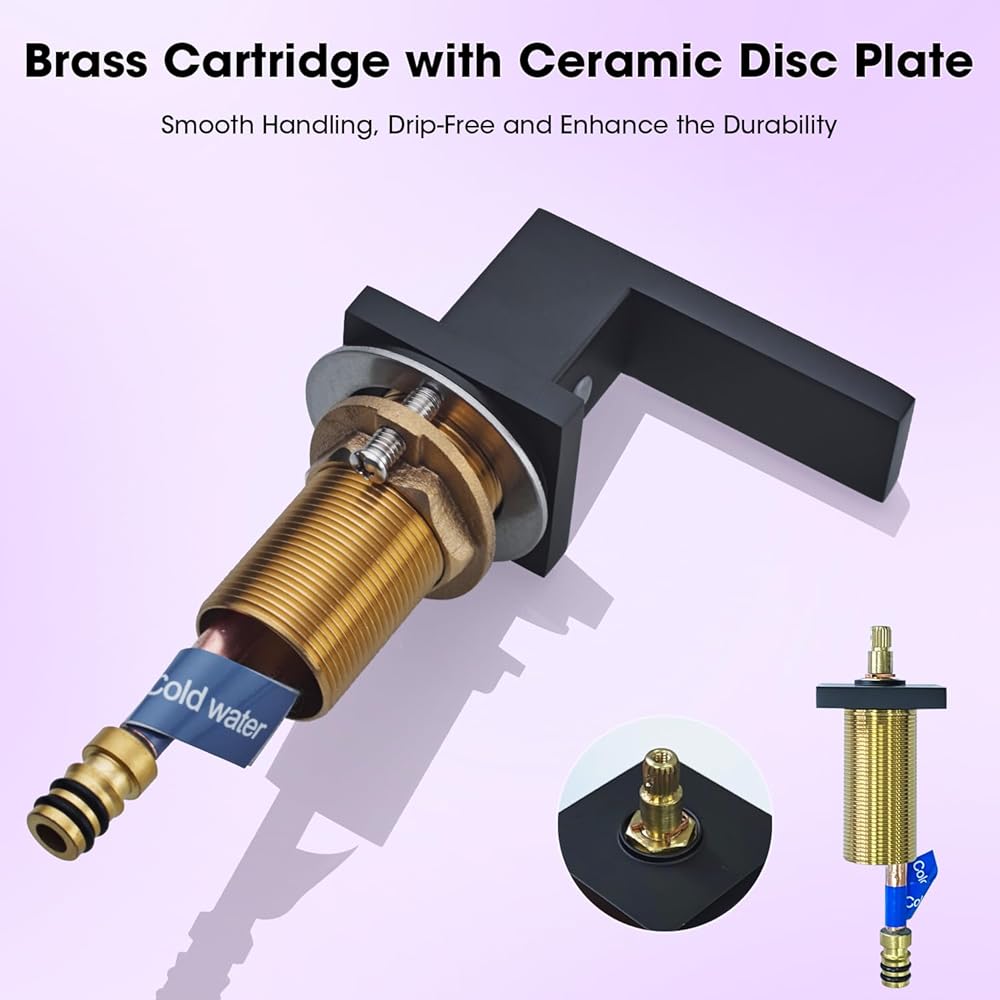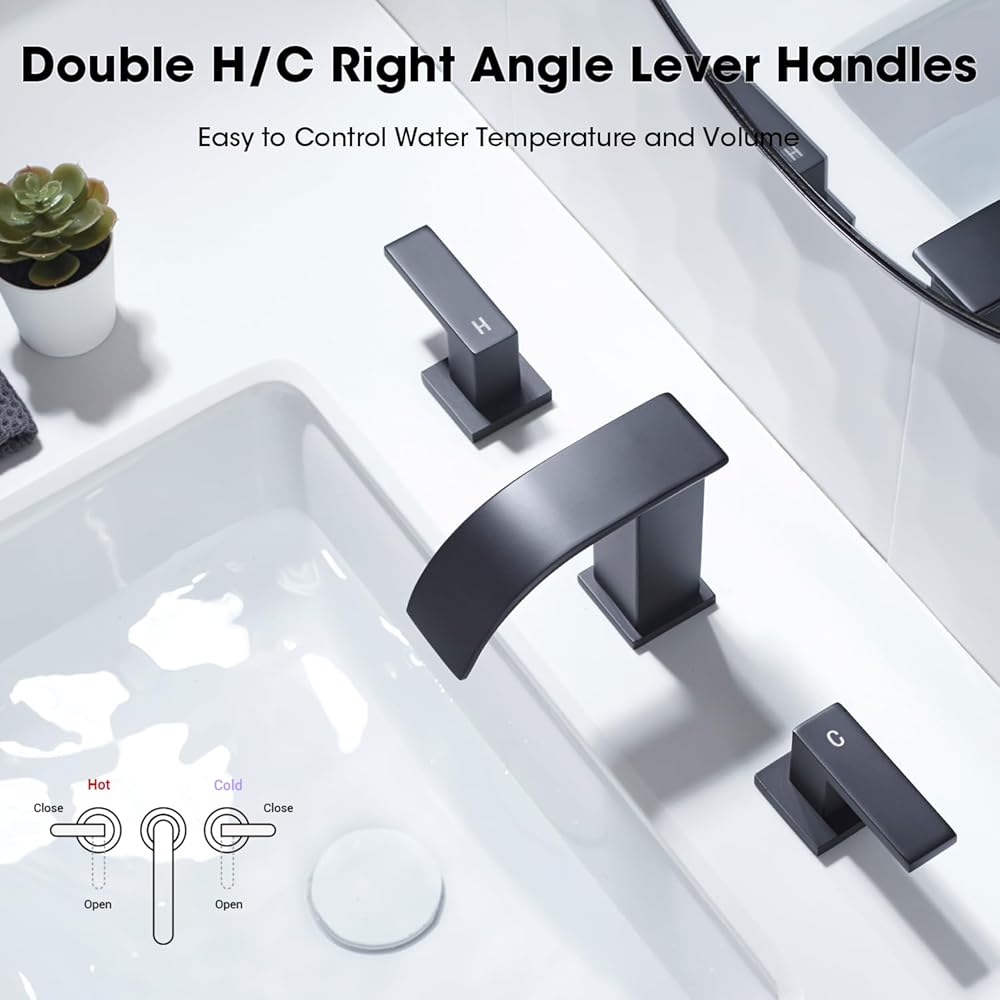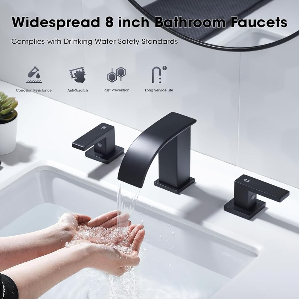 صنبور حوض حمام واسع الانتشار مقاس 8 بوصات مع مقبضين للتحكم الدقيق في درجة حرارة المياه وحجمها، خرطوشة نحاسية مع لوحة قرص سيراميك للتعامل السلس، خالية من التنقيط وتعزيز المتانة
