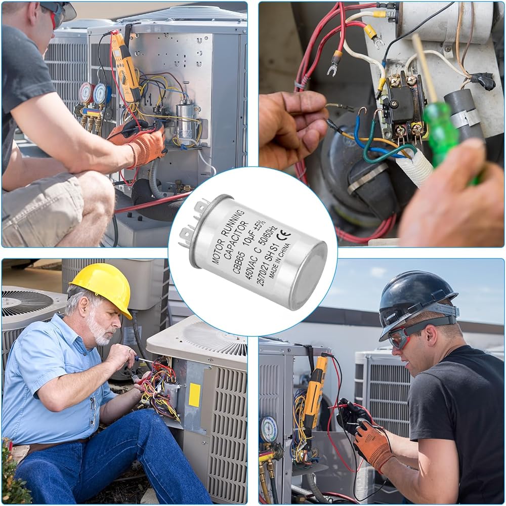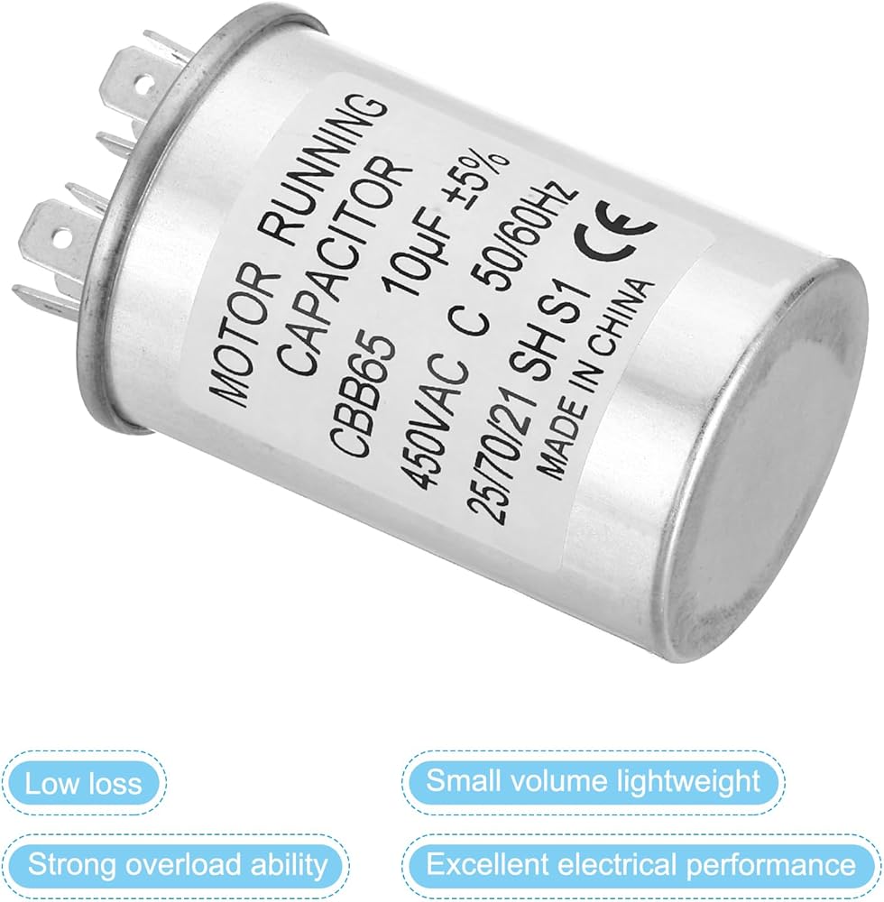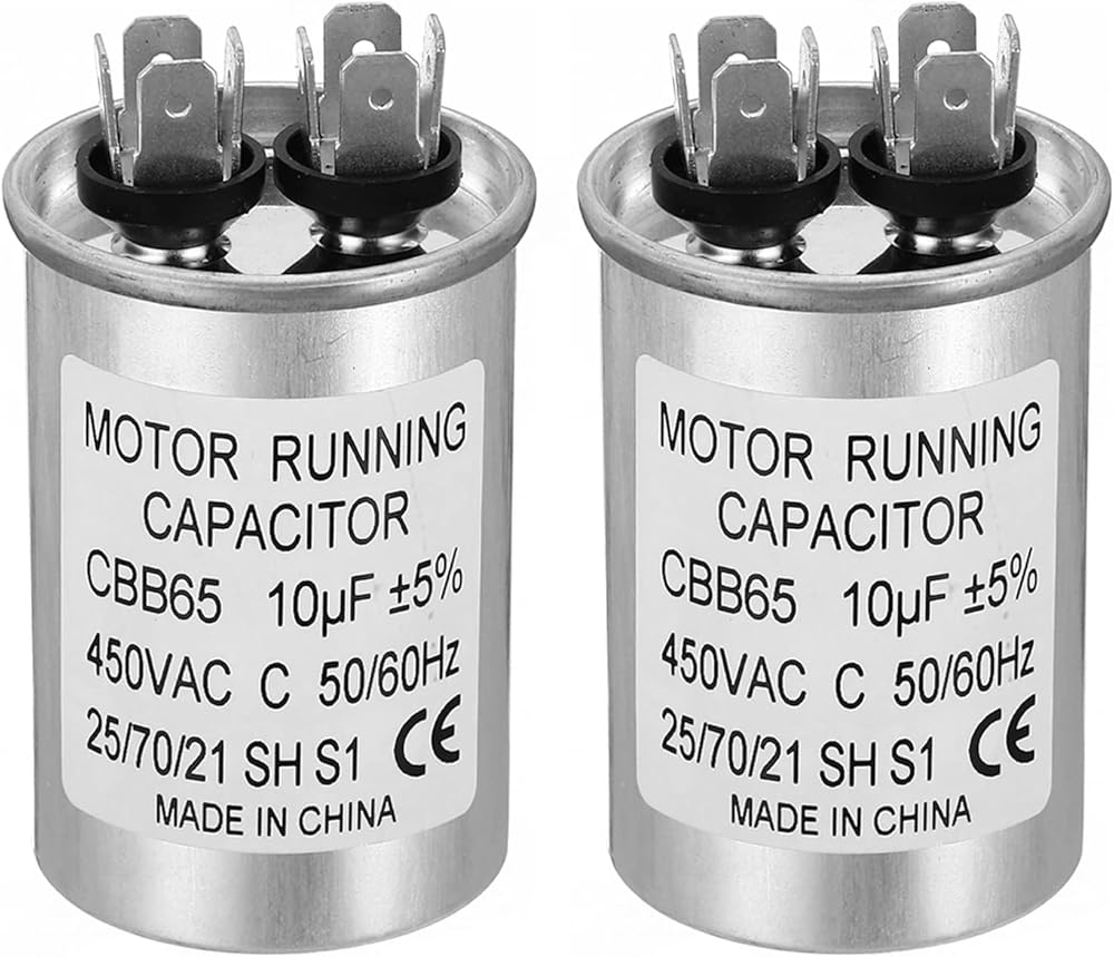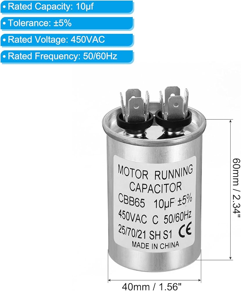 Specification:Model: CBB65;Material: Metallized Polypropylene, Aluminum Case;Lead End: 2 Terminal(4+4pins);Rated Capacity: 10uf;Tolerance: ±5%;Rated Voltage: 450VAC;Rated Frequency: 50/60Hz;Climatic Category: 25/70/21;Overall Size: 40 x 60mm/1.56 x 2.34inch (D x H); Package Includes: 2Pcs x CBB65 Capacitor