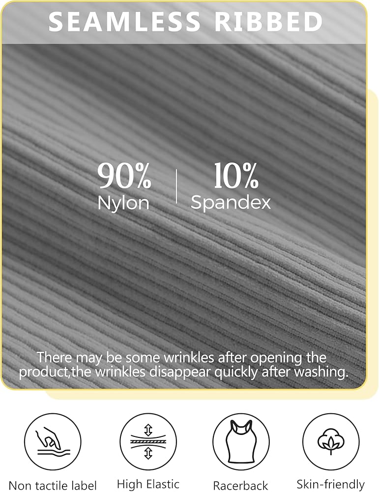 【Warm Tips】For hygiene reasons, pur tank tops packaging is disposable and well-sealed. We ensure that each of our customers will receive the brand new tank tops, not the returned ones/secondary-sale product. 【Seamless Ribbed Cami Tank】We have 3 lengths and 5 Colors to choose!Crop/Long Crop/Waist Length design, seamless rib fabrication,4-way stretch fabric,skin-friendly and soft.Seamless rib fabrication, racerback design, entry-level compression. 【Comfortable material】: The sleeveless racerback tank is 90% Nylon, 10% Spandex, soft and lightweight, have good elasticity and breathability, comfortable for you to wear for a long time. The proper elasticity makes it close to your skin, not too tight or loose, giving you a comfortable wearing experience.