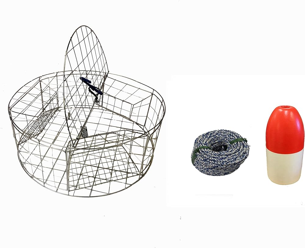 KUFAKUFA مصيدة سرطان البحر المستديرة المصنوعة من الفولاذ المقاوم للصدأ مع زنك الأنود المضحي وحبل الرصاص 1/4 × 100 بوصة، عوامة حمراء/بيضاء مقاس 35.56 سم، حزام الأمان، الفرجار، مجموعة حقيبة الطعم (CT120+CAQ3+ZIN1)