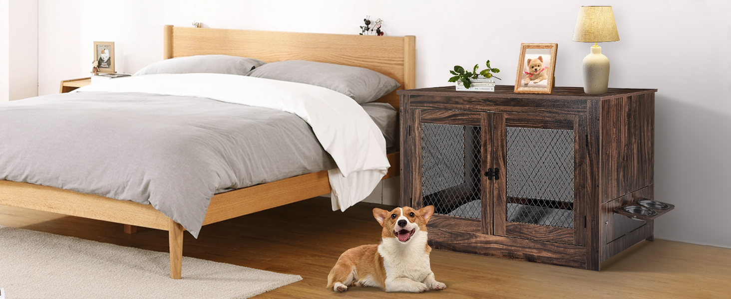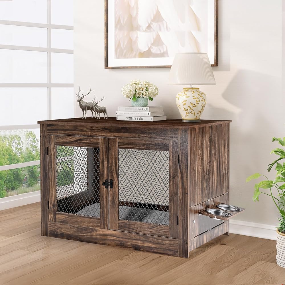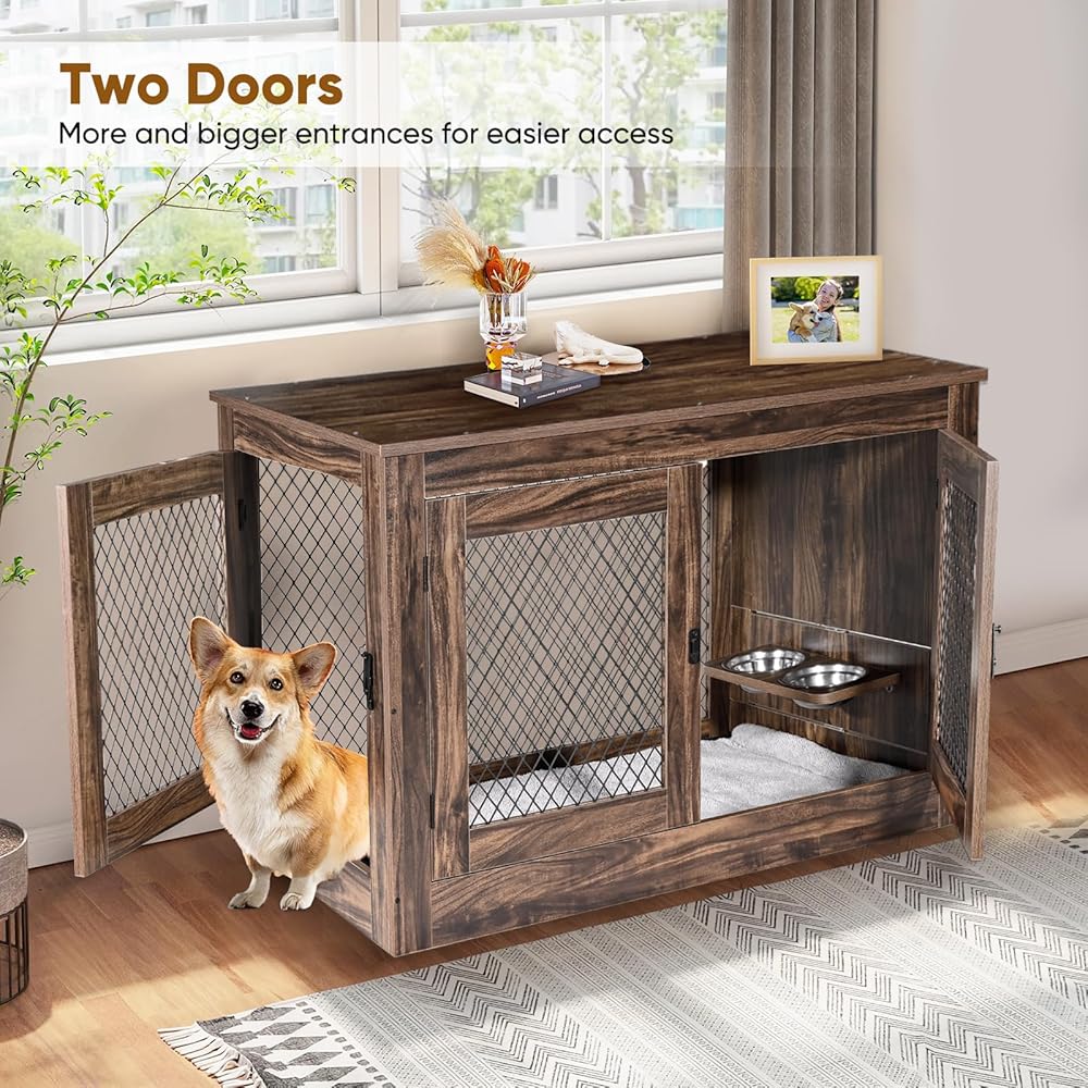 أثاث قفص للكلاب مع أوعية للكلاب قابلة للدوران بزاوية 360 درجة، وطاولة نهاية خشبية لبيت الكلاب مقاس 41 بوصة مع وسادة وصينية وأبواب مزدوجة، للاستخدام الداخلي في بيت قفص الحيوانات الأليفة للكلاب المتوسطة والكبيرة (بني)