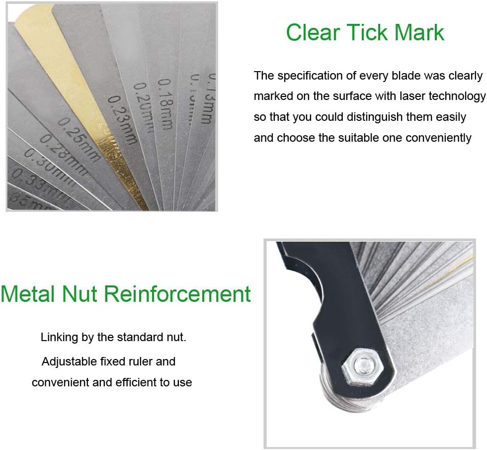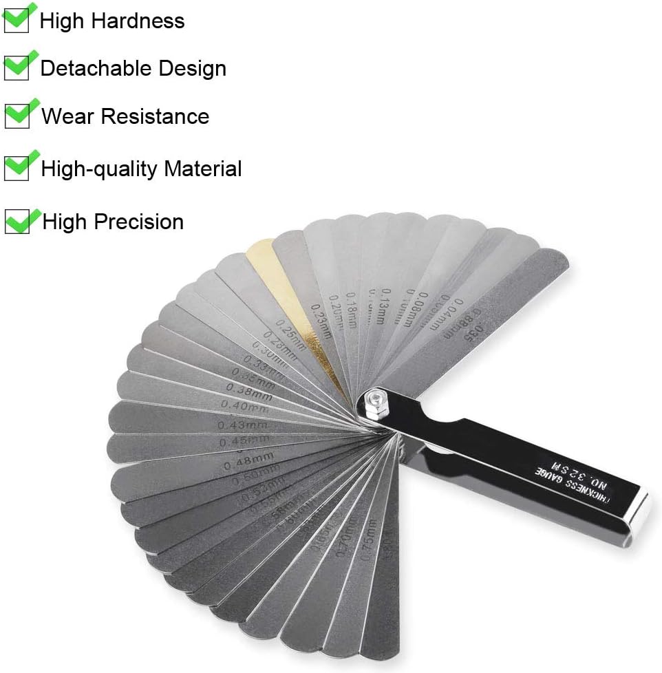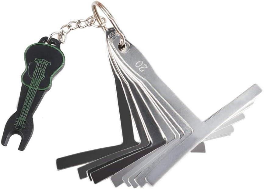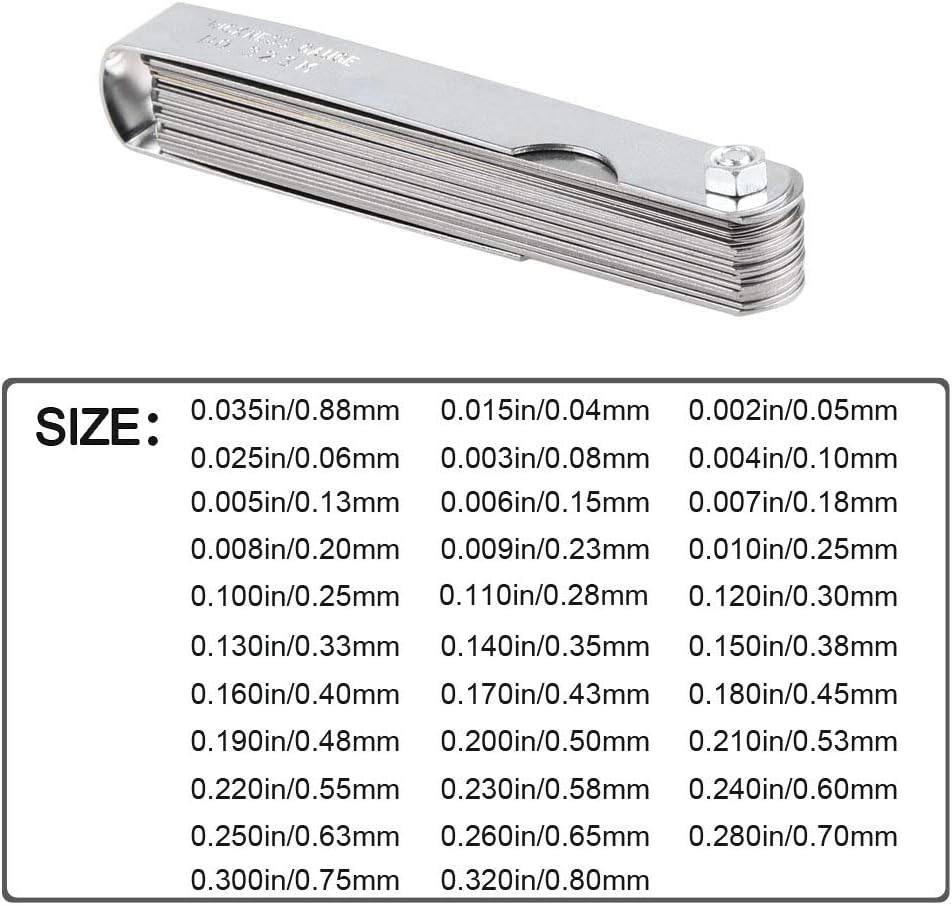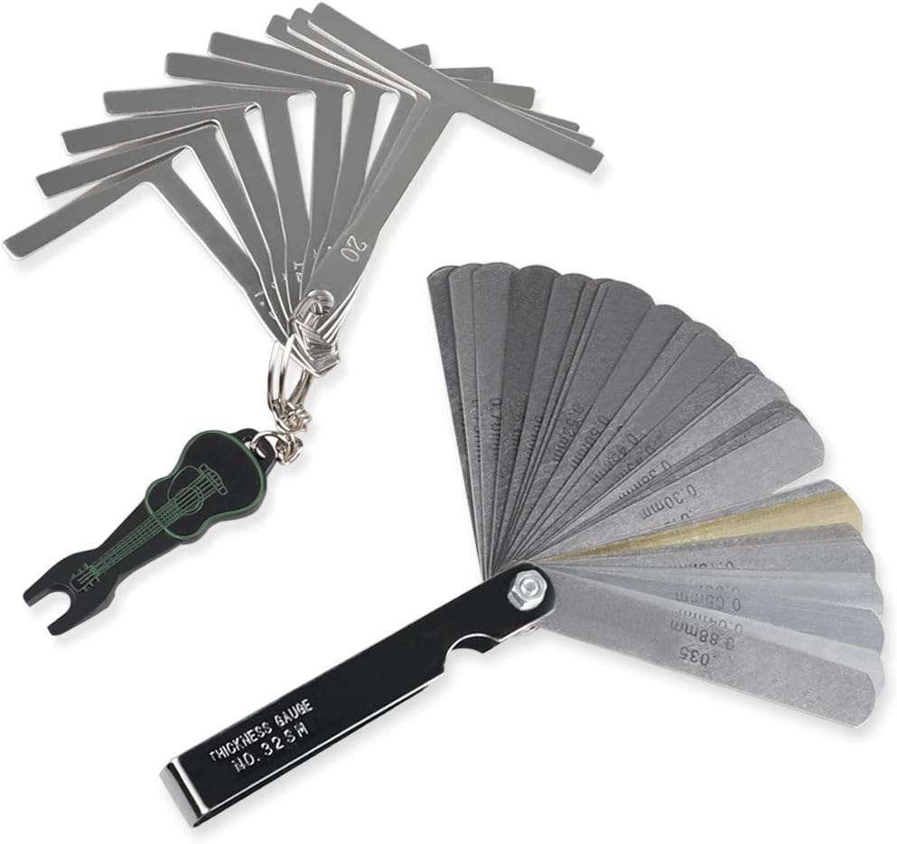 【مقياس 32 شفرة】32 شفرة فولاذية مقوية، قياس من 0.0015 بوصة (0.038 مم) إلى 0.035 بوصة (0.889 مم)، إنها أداة قياس مسافة وتر الجيتار الشائعة، عمود رئيسي مطلي بالكروم لسهولة التنظيف والاحترافية. ينظر. يمكن تطبيقه لقياس جميع أنواع الجيتار الكهربائي، والباس الكهربائي، والجيتار الصوتي، والجيتار الصوتي، ولوحة الفريتس للجيتار الكهربائي المقاسة بالراديان، والراديان لضبط كود أوتار البيانو