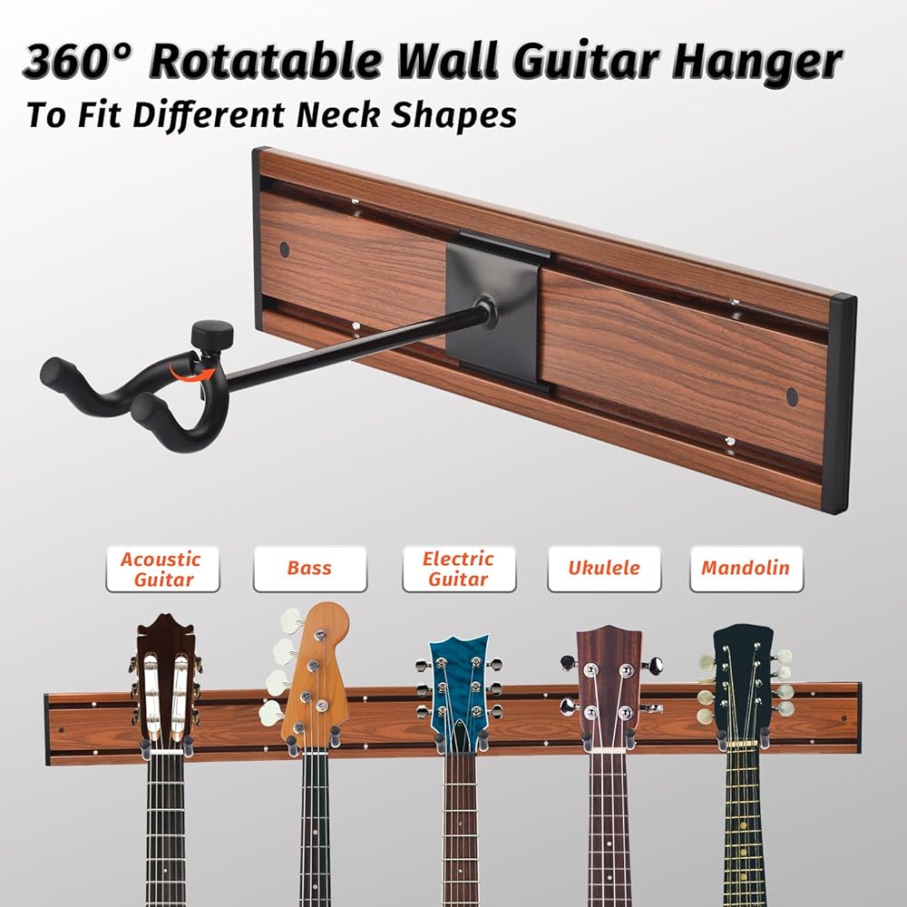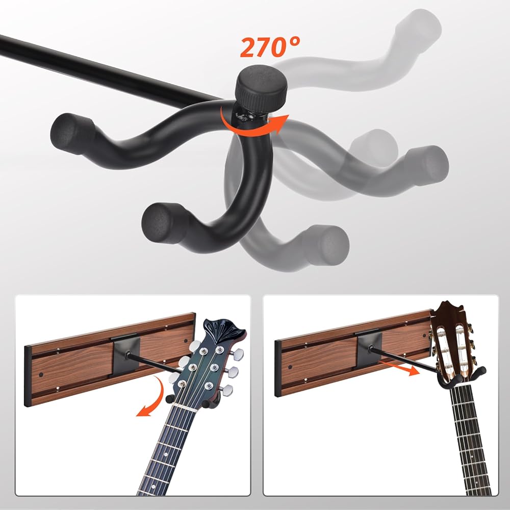 خطافات قابلة للدوران لمختلف الجيتارات: الخطافات قابلة للتعديل بزاوية 270 درجة، مما يعني أنه يمكنك ضبط زاوية الجيتار الخاص بك لتناسب جمالية الغرفة. ينزلق حامل الجيتار على الحائط إلى اليسار واليمين لوضع كل أداة في المكان الذي تريده بالضبط. يمكن لحامل الجيتار القابل للتعديل من MOREYES الدوران 360 درجة ليناسب الجيتارات ذات أغطية الرأس غير المتماثلة، والعمل مع العديد من أنواع الأدوات، مثل الجيتارات الكهربائية، والجيتارات الصوتية، وجيتار الجير، والقيثارات وما إلى ذلك.