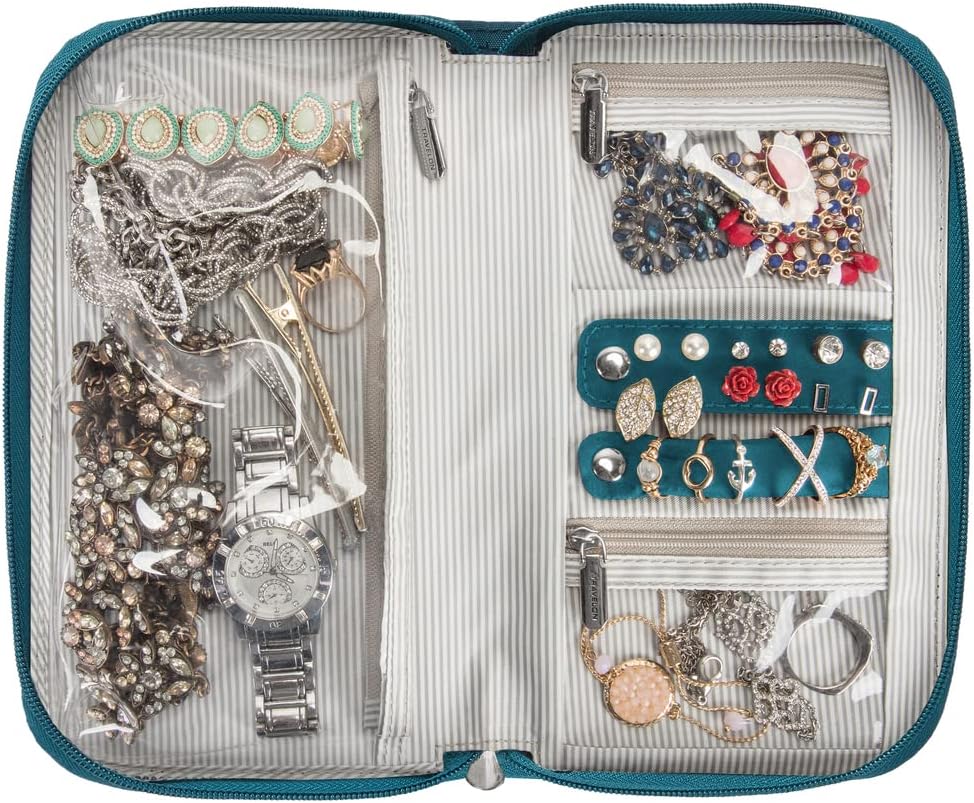 - تصميم داخلي فعال للأكياس المزودة بسحاب، وحامل الأقراط والقضيب الدائري يبقي مجوهراتك منفصلة أثناء السفر