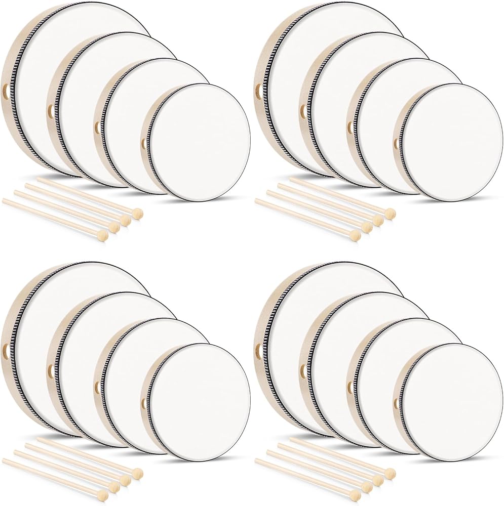 16 قطعة طبلة يدوية مع 16 قطعة طبلة عصا 6 بوصة 8 بوصة 10 بوصة 12 بوصة إطار خشبي طبل الكبار الأطفال الطبول الموسيقية التعليمية الآلات الإيقاعية للمنزل والمدرسة والحفلات، أبيض