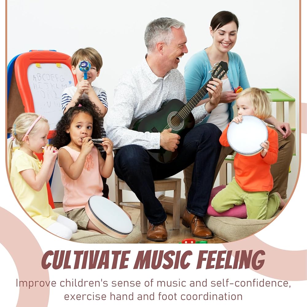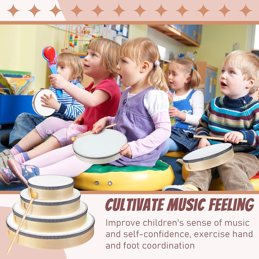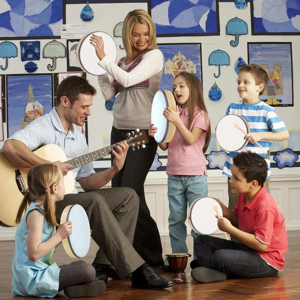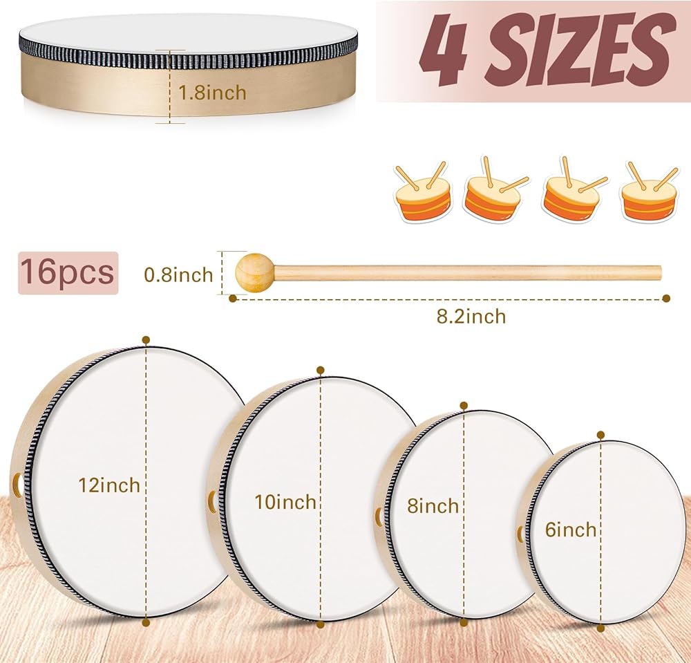 • محتويات العبوة: تأتي هذه المجموعة كاملة مع 16 طبلة يدوية إيقاعية، كل منها في 4 أحجام (12، 10، 8، و6 بوصات) بالإضافة إلى عصي الطبل؛ هذه أدوات مثالية للأطفال والكبار، وتوفر الكثير من الخيارات للعائلة والأصدقاء للمشاركة في المرح الموسيقي
