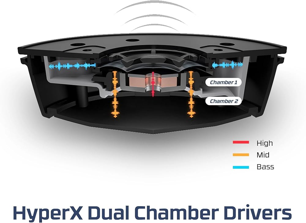 • [برامج تشغيل HyperX Dual Chamber] - يسمح فصل ترددات الجهير عن الترددات المتوسطة والعليا بضبطها بشكل منفصل لتوفير مزيد من التمييز بين الأصوات وتقليل التشوه.