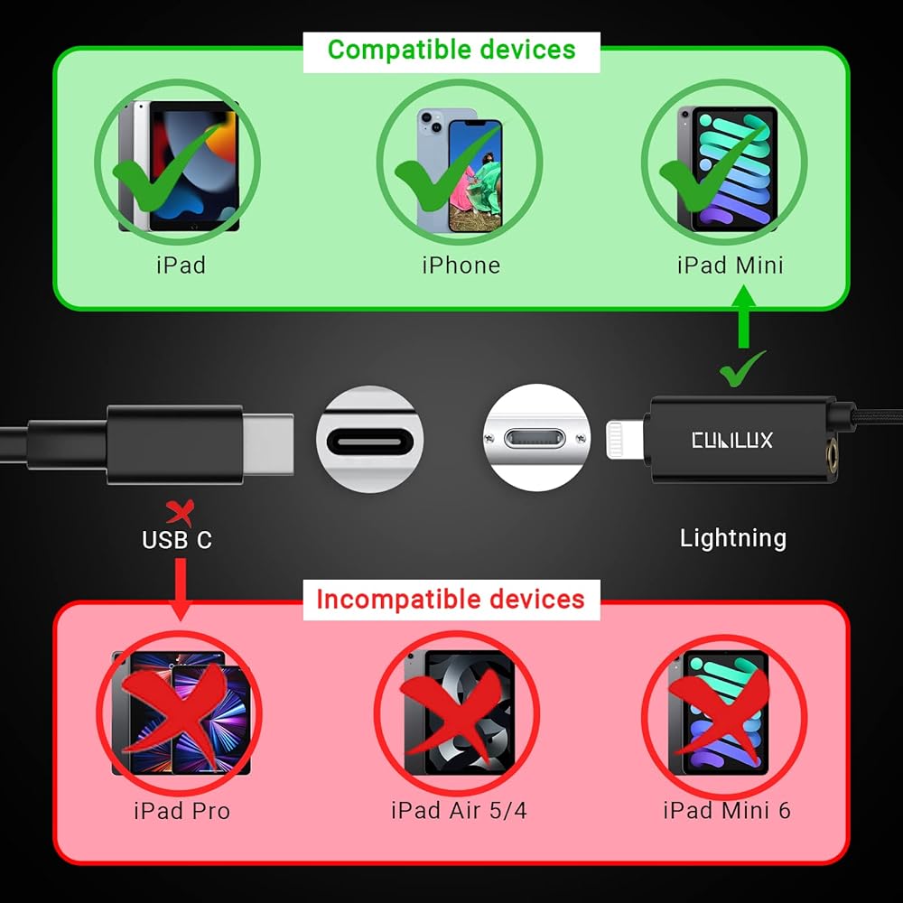 [توافق واسع] - قم بالتوصيل والتشغيل على أجهزة Apple المزودة بمقبس Lightning، مثل iPhone وiPad وiPad Air وiPad Pro وiPad Mini وما إلى ذلك.
