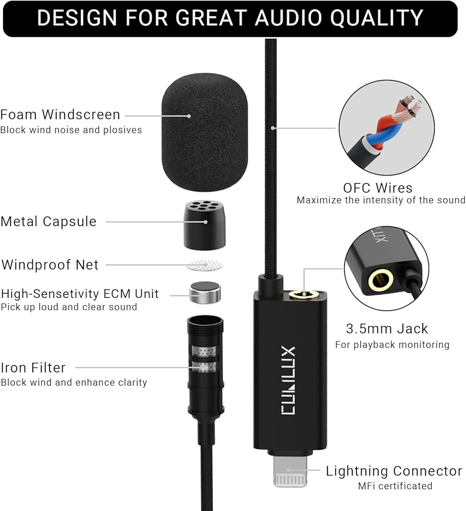 [أداء صوتي فائق] - يضمن موصل Lightning المعتمد من MFI جودة صوت ممتازة بالإضافة إلى اتصال مستقر وموثوق. باستخدام وحدة ECM متعددة الاتجاهات عالية الحساسية، يلتقط الميكروفون صوتًا عاليًا وواضحًا، وهو مثالي للغناء والمقابلات والبث المباشر واجتماعات الفيديو والإملاء وما إلى ذلك.