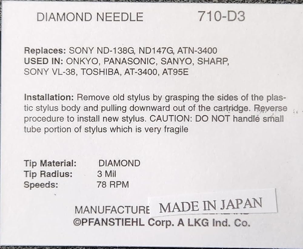 Replaces the following needles: PANSONIC EPS-75 EPS75 EPS-75SMAD EPS75SMAD EPS-75SMLD EPS75SMLD EPS-75STCSD EPS75STCSD EPS-75STSD EPS75STSD EPS-77SMBD EPS77SMBD EPS-77ST EPS77ST EPS-77STSD EPS77STSD EPS-8 EPS8 EPS-10 EPS10 Fits the following cartridges: PANSONIC EPC-75 EPC75 EPC-75SMAD EPC75SMAD EPC-75SMCD EPC75SMCD EPC-75SMLD EPC75SMLD