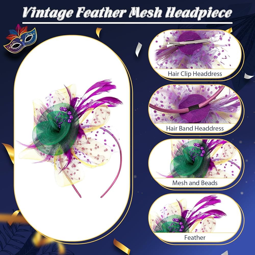 تصميم خادع: أغطية الرأس النسائية المصنوعة من الريش باللون الأرجواني والأصفر والأخضر مليئة بتجسيد الأناقة؛ مزينة بشبكة جذابة وريش وإبزيم رأس آسر، يعتمد على اللون الأخضر الكلاسيكي والأرجواني والأصفر، مما يضيف عنصرًا من الرقي والسحر إلى ملابس ماردي جراس الخاصة بك دون عناء.