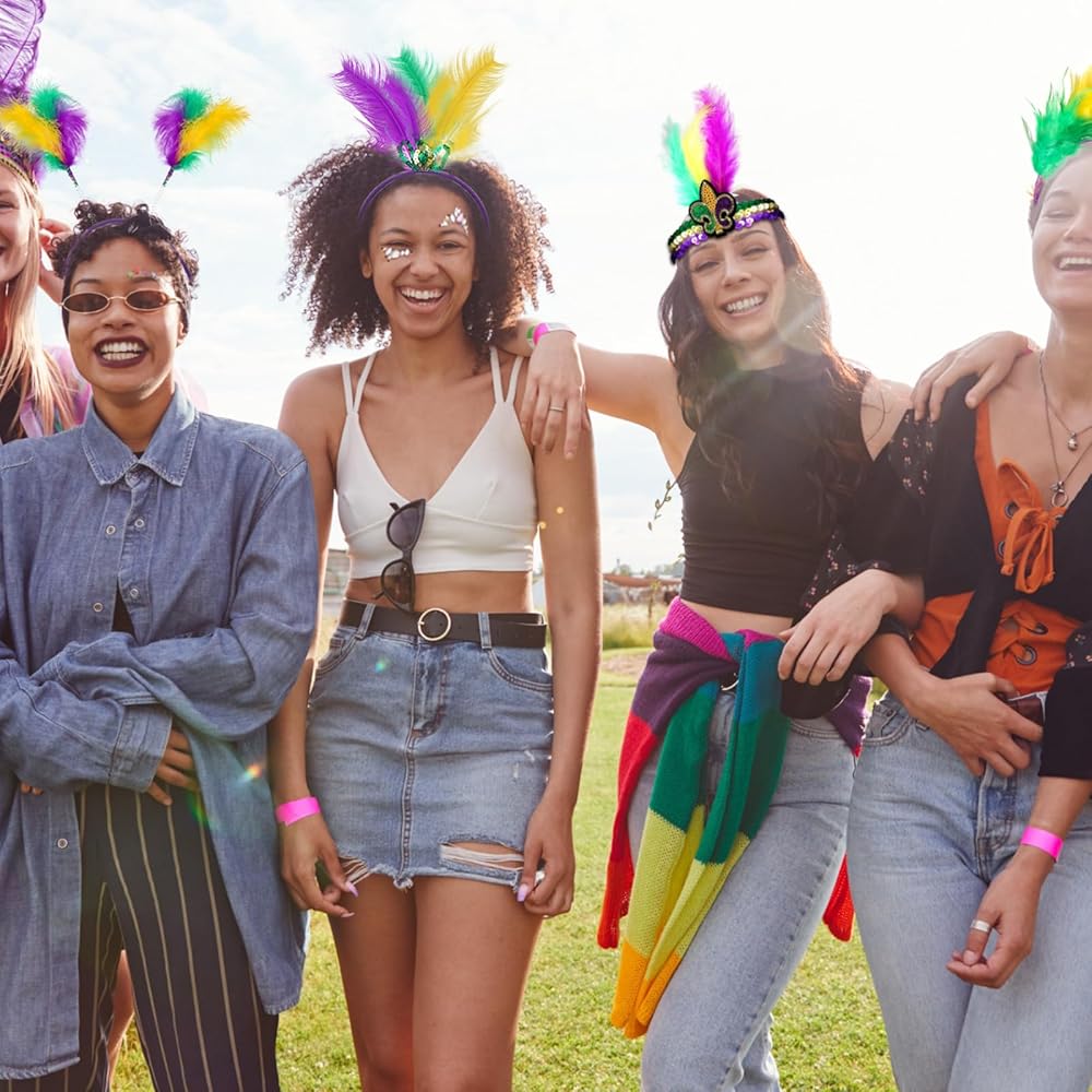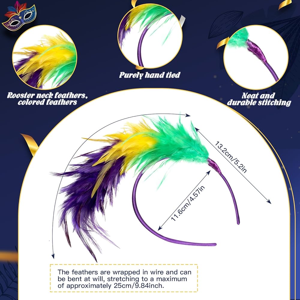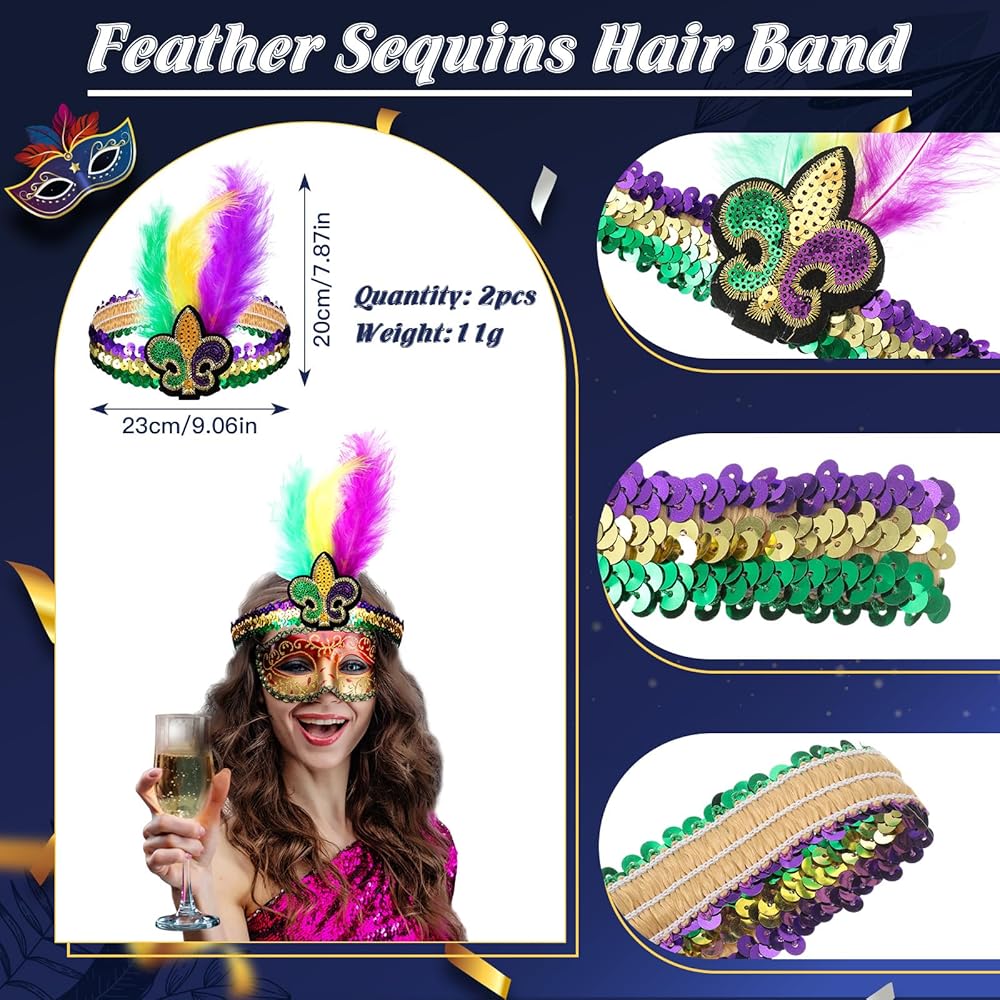 تصميم رائع: عصابة الرأس ماردي جراس للنساء مزينة بمزيج من الترتر الملون النابض بالحياة والريش الصناعي ورمز فلور دي ليز، وهو أمر أساسي لماردي جراس؛ هذا الاهتمام الدقيق بالتفاصيل يجعل كل عصابة رأس عملاً فنيًا فريدًا مصنوع يدويًا