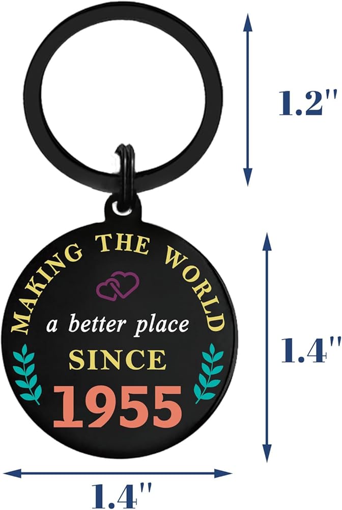 سلسلة مفاتيح لعيد الميلاد عام 1954 - الجانب الأمامي مكتوب عليه "جعل العالم مكانًا أفضل منذ عام 1954"، والجانب الخلفي مكتوب عليه "عيد ميلاد سعيد السبعين! خلفك، كل ذكرياتك. أمامك، كل أحلامك. من حولك، كل من تحب بداخلك كل ما تحتاجه."