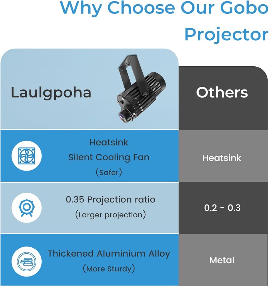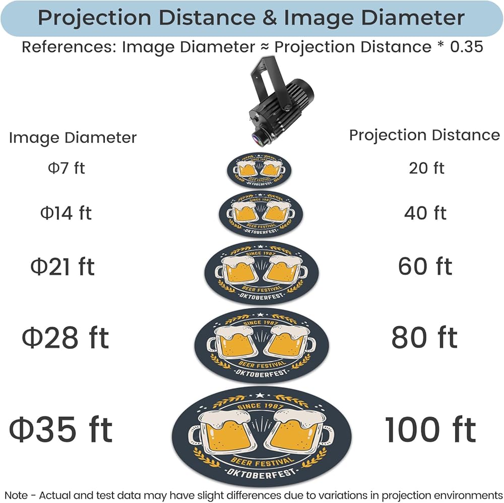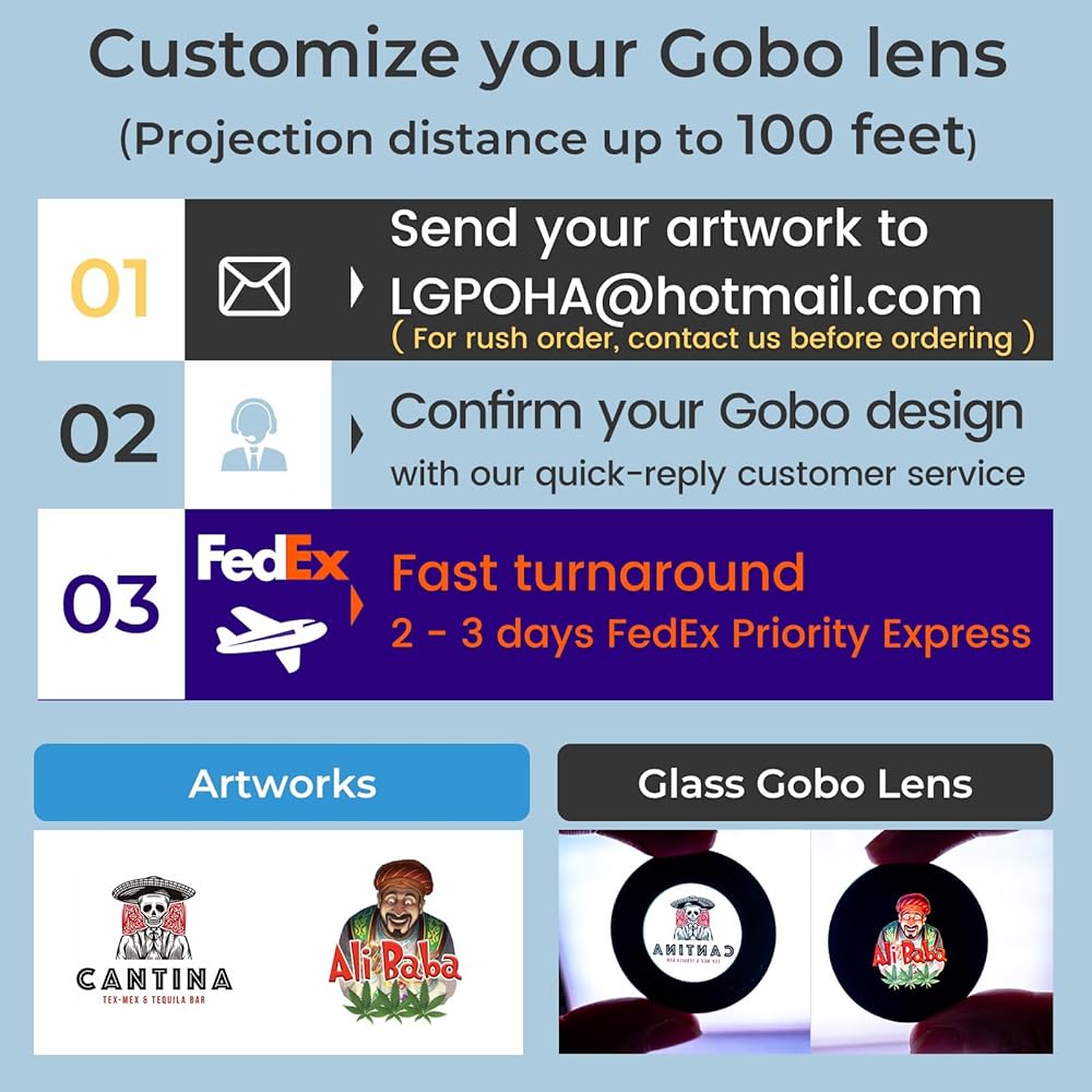 • [تصميم مرن وصيانة منخفضة] يوفر كل جهاز عرض عدسة gobo مجانية تصل إلى لونين (يتم تسليمها بشكل منفصل) للحصول على خيارات تصميم لا حدود لها، ويمكن استبدالها بسهولة لتغيير النمط. فعالة من حيث التكلفة مع صيانة منخفضة لاحتياجات عرض شعارك.