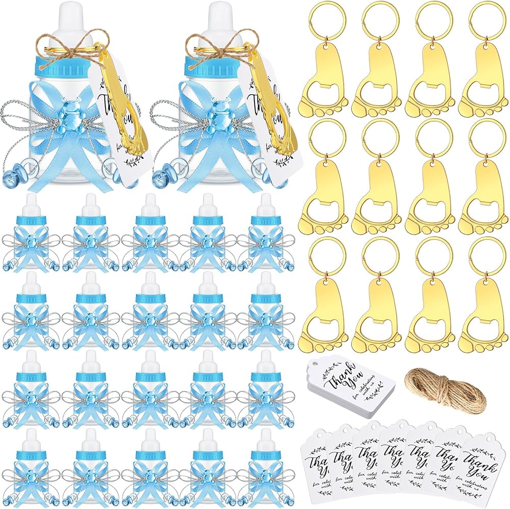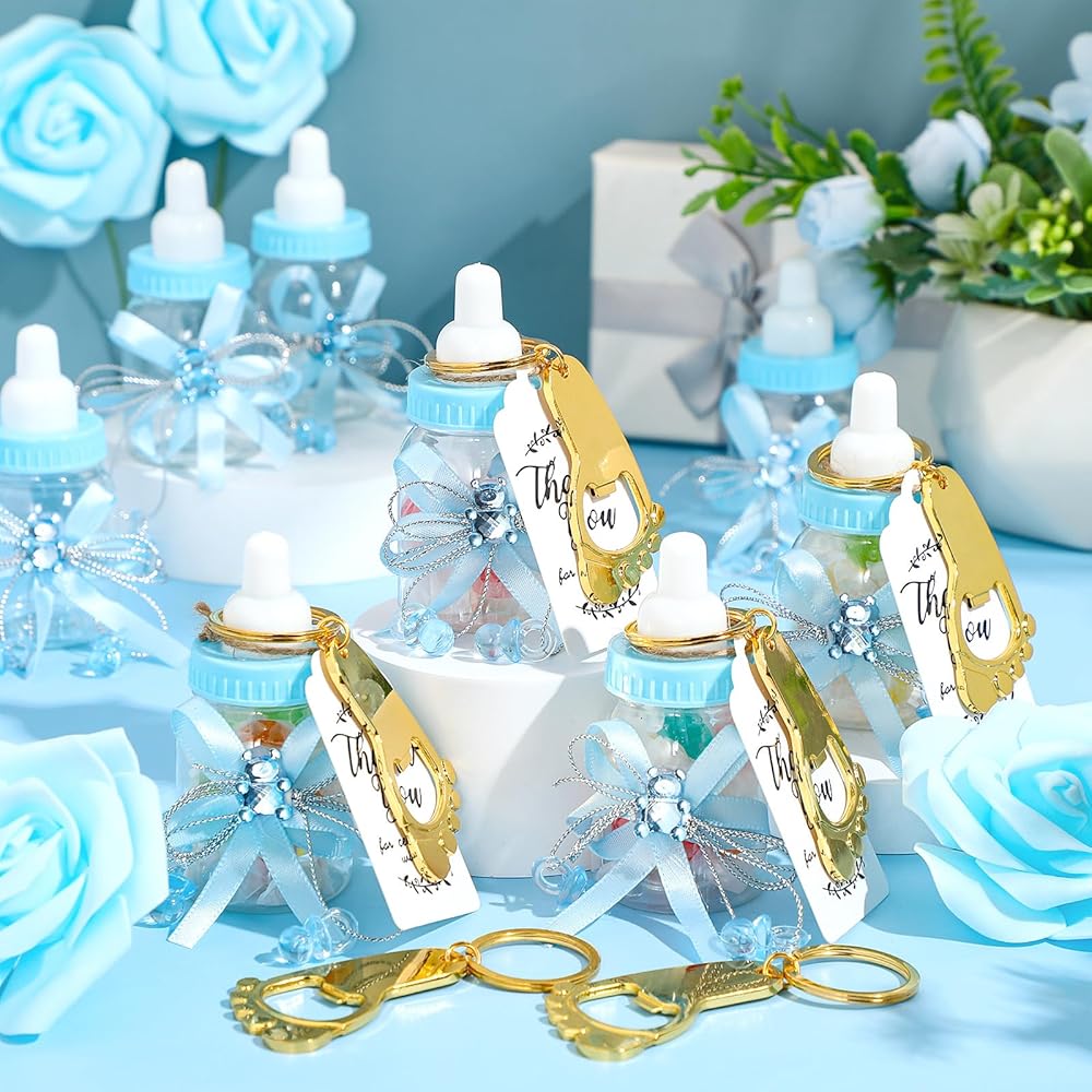 72 قطعة من هدايا زجاجات استحمام الأطفال من Sunnyray، 24 زجاجة حليب صغيرة للأطفال، 24 فتاحة زجاجات على شكل سلسلة مفاتيح ببصمة قدم الطفل، 24 بطاقة شكر، هدية هدايا للحفلات للفتيات الصبيان (أزرق، ذهبي)