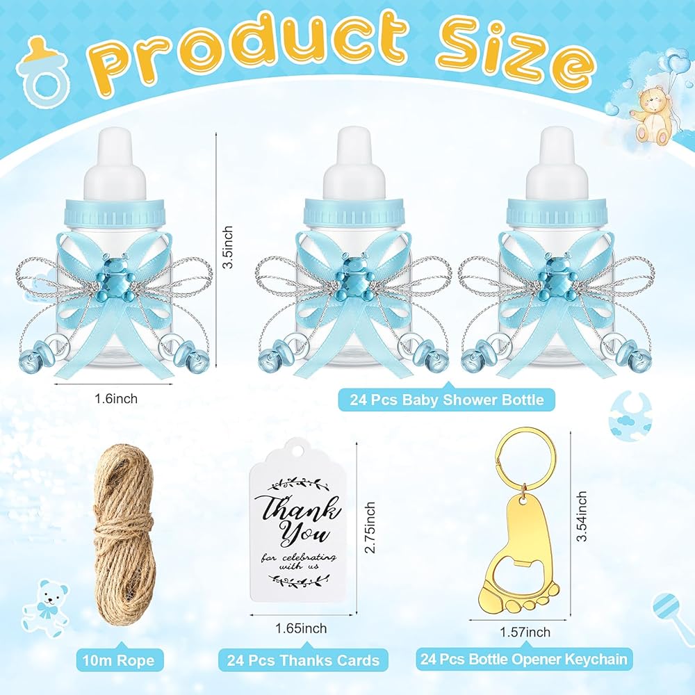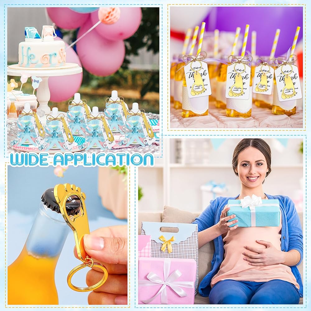 • مجموعة هدايا زجاجات استحمام الطفل: سوف تحصل على 24 قطعة من زجاجات الأطفال البلاستيكية لاستحمام الطفل، و24 قطعة من فتاحة زجاجات سلسلة مفاتيح ببصمة الطفل، و24 قطعة من بطاقات الشكر، وحبل بطول 10.94 ياردة/ 10 أمتار، سوف ترضي المجموعة المدروسة حاجتك لحفلات استحمام الطفل وحفلات أعياد الميلاد وغيرها من الحفلات