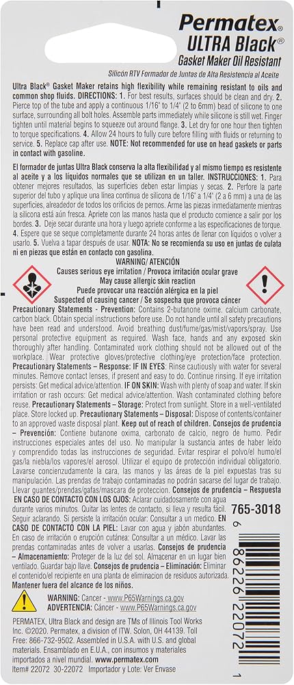Non-toxic compound can be used on valve cover, compressor, gearbox, transmission, oil pans and more. Substrates aluminum, brass, iron, steel. Composition: calcium carbonate, poly (dimethylsiloxane), hydroxy terminated, polydimethylsiloxane, vinyl oximinosilane, stearic acid, 2-butanone oxime. Appearance: Metallic black.